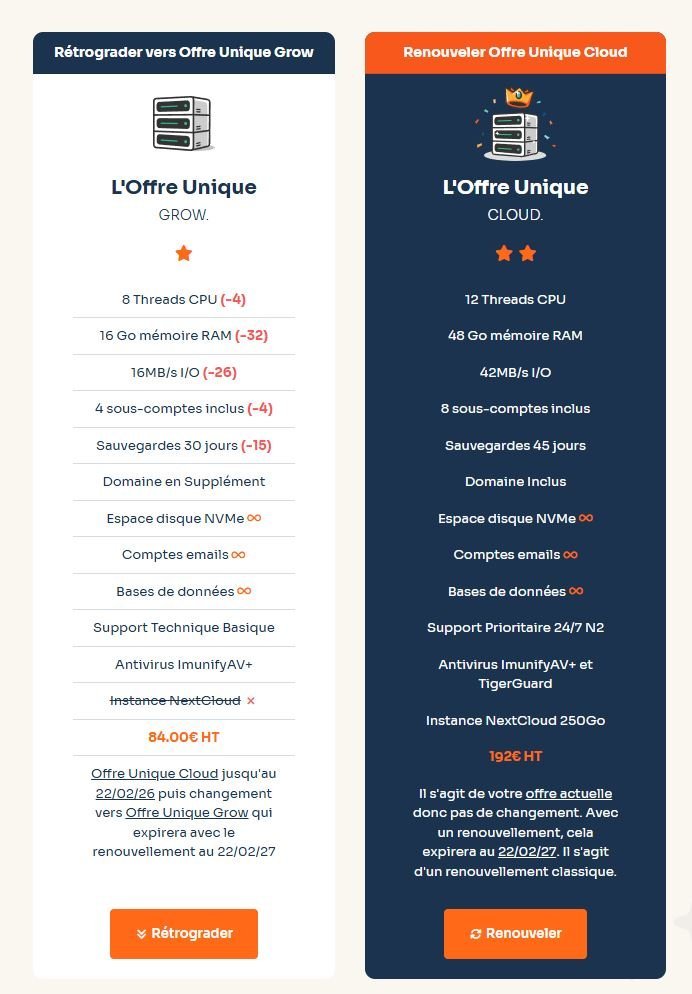 Cinephoenix Posted December 1 Share Posted December 1 (edited) On 5/22/2025 at 2:38 PM, Coeur_De_Lion said: Pour ceux qui cherchent à revenir sur la formule Offre Unique de base appelée "Offre Unique Grow": Compte O2S > Gérer mes Services > Sur la ligne "Offre Unique Cloud", allez complètement à droite sur les 3 petits points et sélectionnez "réajuster l'offre" et là vous pourrez reprendre l'ancienne formule "Offre Unique Grow". A savoir qu'à partir de l'année prochaine le nom de domaine ne sera plus inclut dans la formule "Offre Unique Grow". Donc 1.00€ en moyenne en plus par mois. Si vous gardez l'offre qu'ils vous proposent "Offre Unique Cloud": Vous pouvez si vous le désirez prendre l'offre sur 3 ans en cliquant 2 fois sur le flèche à droite de la proposition de renouvellement. Ce qui revient à 9.00€ht au lieu de 16.00€ht mensuel, soit 324.00€ht (252.00€ d'économie, pour faire passer la pilule) Vous y gagnez un support technique Niveau 2 Prioritaire 24/24 7/7 et le TigerGuard. Par contre il faudra sortir 388.80€TTC d'un coup, ou si j'ai bien vu, paiement en 3 fois sans frais. La machine de la formule "Offre Unique Cloud" est plus puissant mais la plupart des sites de vitrine ou site E-commerce de bases n'en ont pas besoin. Après une demande d'analyse au près de O2S des ressources utilisées, un des site e-commerce mis en place avec 30 à 50 commandes par jours peut rester sans soucis sur la formule "Offre Unique Grow". Il est vrai que mettre tout le monde sur l'offre à 16€, sans analyse d'O2S des ressources utilisées par le compte, est un peu radical. Mais c'est à vous de voir. Mille mercis pour cette info ! Pour ceux qui seraient tentés, en demandant à rétrograder ce message s'affiche : "Prenez garde au nombre de sous-comptes (lunes) inclus avec l'hébergement. Si vous utilisez cette fonctionnalité, en rétrogradant, vous pouvez perdre des sous-comptes qui étaient originellement inclus avec l'offre. Dans ce cas, il faudra prendre l'option pour avoir des comptes supplémentaires pour les conserver actif." Votre satisfaction est une priorité, et nous pensons qu'un passage à l'offre inférieure n'est pas judicieux : vous perdez en ressources, le nom de domaine ne sera plus inclus lors des futurs renouvellements, et le stockage sera moins performant. De même vous ne profitez plus de certains outils de sécurité." Vu que je gère mes noms de domaine par ailleurs, et que je n'utilise pas les sous-comptes, le calcul est vite fait. Par contre, quand on rétrograde, c'est automatiquement à la date de renouvellement du service. Pour un site dont la date de renouvellement est en février 2026, est-ce que cela a un impact sur le serveur où est hébergé le site et faudra-t-il changer le pointage du nom de domaine en février 2026 ? Edited December 1 by Cinephoenix (see edit history) Link to comment Share on other sites More sharing options...