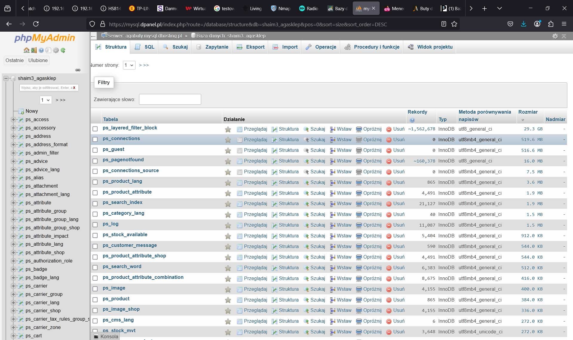 Mam problem z bazą danych w prestashop 1.7. W katalogu jest około 1000 produktów, a jej rozmiar to 31Gb. Wcześniej odzyskałem ok. 4GB bo wykonałem optymalizację tabel z poziomu phpMyAdmin oraz wyczyściłem statystyki. Mimo wszystko 31 Gb wydaje mi się być absurdalną ilością dla 1000 produktów. Co jeszcze może być przyczyną?