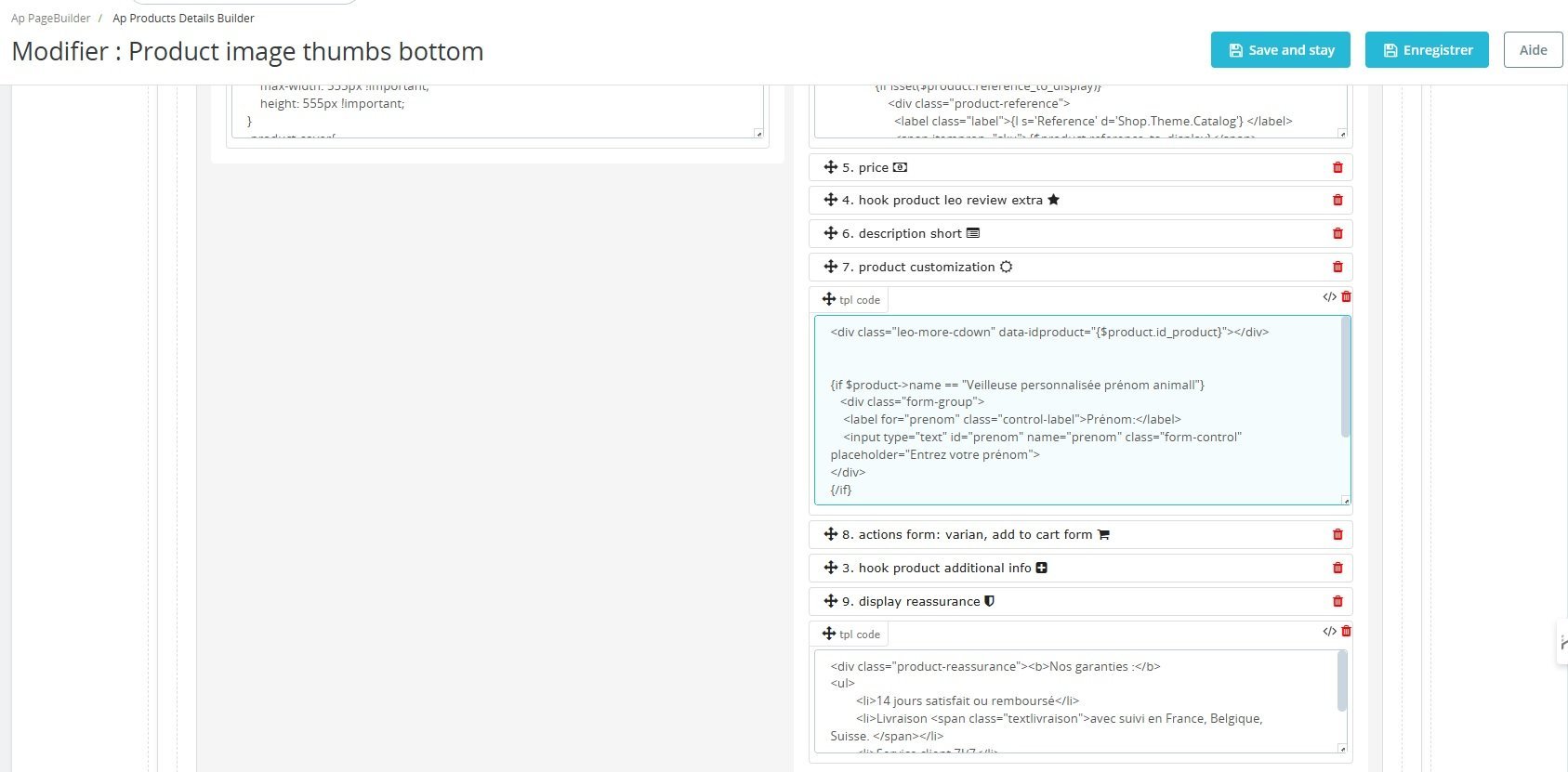 JustineK Posted March 5, 2025 Author Share Posted March 5, 2025 Bonjour et merci pour votre retour. Alors je n'avais pas de cache mais je l'ai activé, et j'ai vidé le cache il n'y a pas eu de changement. Oui il y a eu des modifications j'avais demandé à un développeur d'ajouter la personnalisation sur cette page produit (je n'avais pas vu que c'était possible via la fiche produit elle-même...). Et je viens de voir qu'il avait ajouté un code dans la partie "Ap PageBuilder > Ap Products Details Builder". Je viens de le retirer (sans le supprimer, j'ai ajouté une lettre en plus dans le nom du produit dans le code, voir PJ). En front ça m'a retiré le champ de personnalisation en trop (voir PJ). Je dirais que le problème vient de "product_actions_form.tpl" mais je vois rien dans le code qui a l'air suspect (PJ à l'appui). Merci de votre aide ! Link to comment Share on other sites More sharing options...