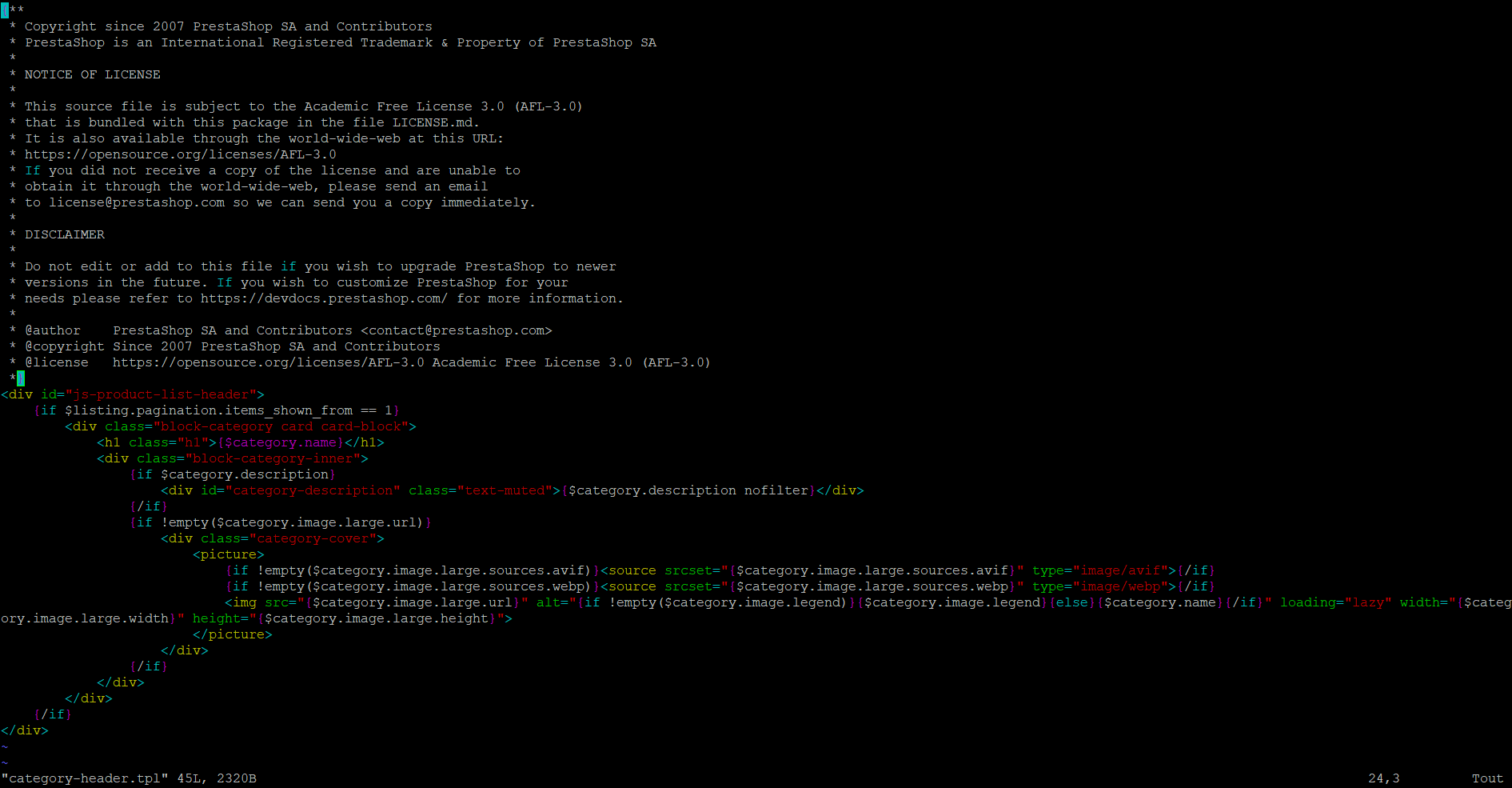 Tristars25 Posted March 7, 2025 Author Share Posted March 7, 2025 3 hours ago, Prestashop Addict said: Si vous utilisez le thème classic c'est en dur dans le template 😞 Il faut modifier le fichier themes/classic/templates/catalog/_partials/category-header.tpl <img src="{$category.image.large.url}" alt="{if !empty($category.image.legend)}{$category.image.legend}{else}{$category.name}{/if}" loading="lazy" width="141" height="180"> Soit vous supprimez les attributs width et height (pas recommandé en SEO) soit vous mettez les valeurs de l'objet <img src="{$category.image.large.url}" alt="{if !empty($category.image.legend)}{$category.image.legend}{else}{$category.name}{/if}" loading="lazy" width="{$category.image.large.width}" height="{$category.image.large.height}"> Très bonne idée ! J'ai changé le fichier category-header.tpl : Mais cela ne fonctionne toujours pas, aucun changement sur l'image. Pour info j'ai bien désactivé le cache : Link to comment Share on other sites More sharing options...