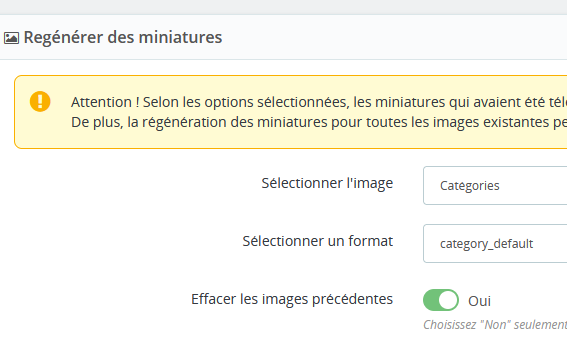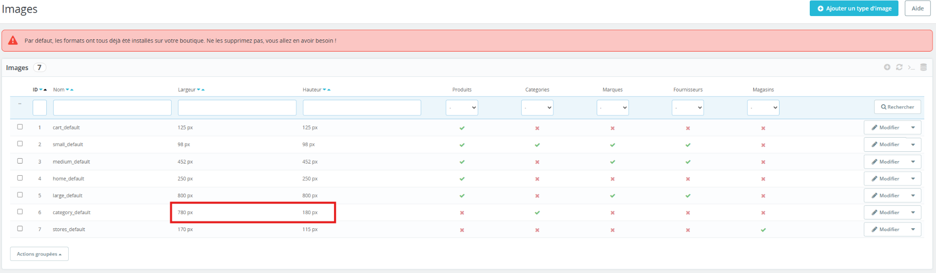 Tristars25 Posted March 6, 2025 Author Share Posted March 6, 2025 7 hours ago, Prestashop Addict said: Si vous créez une nouvelle entrée dans les formats d'images il faut modifier le template. Ok dans ce cas je ne créé aucune nouvelle entrée, je modifie le format dans la catégorie par défaut "category_default" à 785 x 180 px. Le problème reste le même. Avez-vous une autre piste ? Merci beaucoup Link to comment Share on other sites More sharing options...
