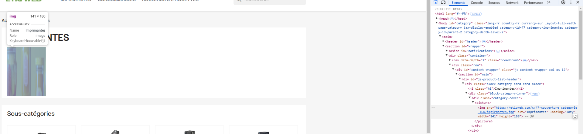 Prestashop Addict Posted March 10, 2025 Share Posted March 10, 2025 Dans theme.css la taille est en dur aussi 😞 .block-category .block-category-inner .category-cover img { width: 141px; height: 180px; } remplacer par : .block-category .block-category-inner .category-cover img { width: auto; max-width:100%; height: auto; } Et il y a un bug dans l'affectation de la variable image.large, changez le template en <img src="{$category.image.bySize.category_default.url}" alt="{if !empty($category.image.legend)}{$category.image.legend}{else}{$category.name}{/if}" loading="lazy" width="{$category.image.bySize.category_default.width}" height="{$category.image.bySize.category_default.height}"> 1 Link to comment Share on other sites More sharing options...
