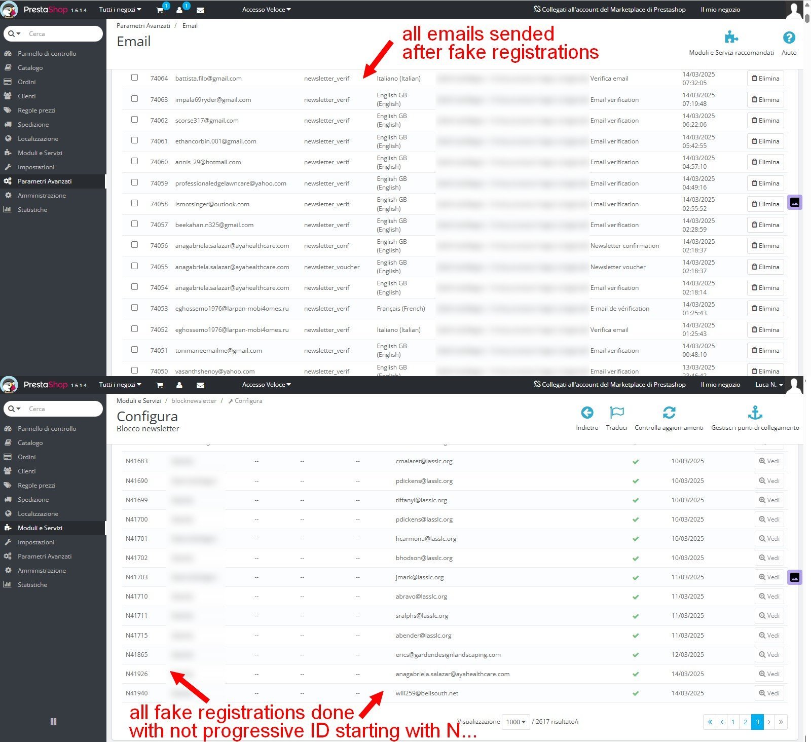 ho Prestashop 1.6.1 e da un po' di mesi riscontro molti tentativi di iscrizione fake alla newsletter, alcuni dei quali vanno a buon fine (vedi immagine sotto). Ho provato a proteggere il modulo della newsletter con Google reCaptcha v.2 e v.3 ma non cambia nulla. In effetti, sembra che i bot riescano ad iscriversi senza passare dal modulo newsletter del sito, visto che la numerazione delle loro iscrizioni non è progressiva e inizia con un id del tipo "N12345" invece che avere un id progressivo solo numerico (ad es. 12345), come accade per gli utenti veri che si iscrivono alla newsletter.