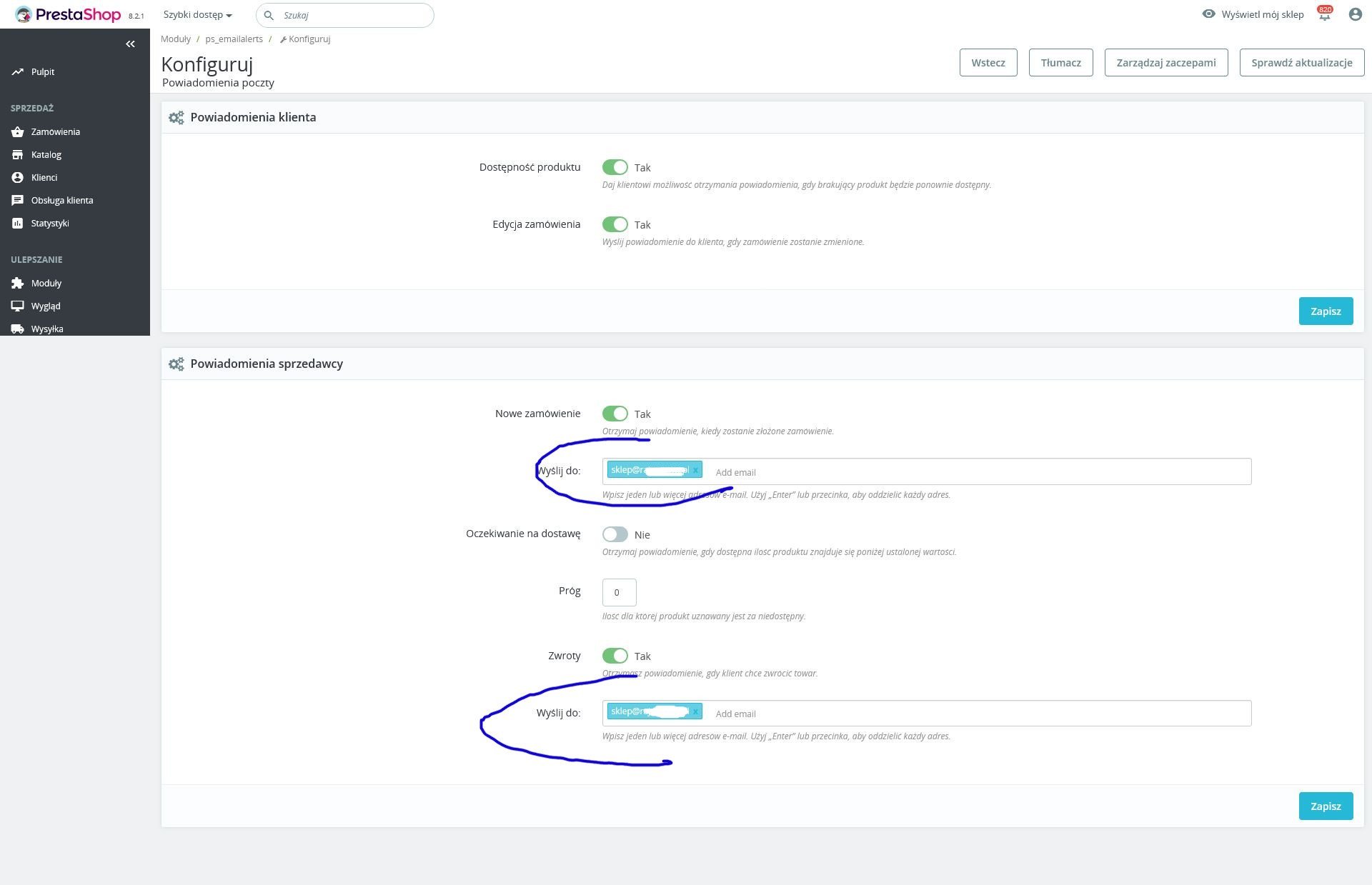 Brak powiadomień email dla sprzedawcy [Prestashop 1.7.8.11]
