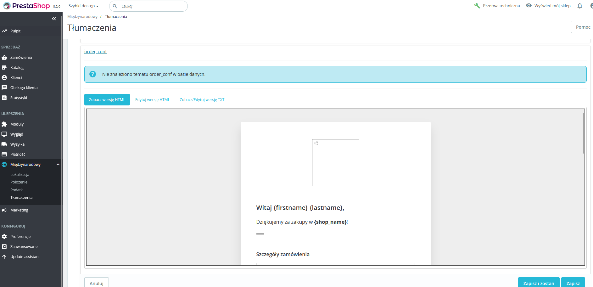 Edytuj Międzynawowy - Tłumaczenia - Tłumaczenia emaila - Treść wybierz szablon + język i edytuj szablon emaila  order_conf