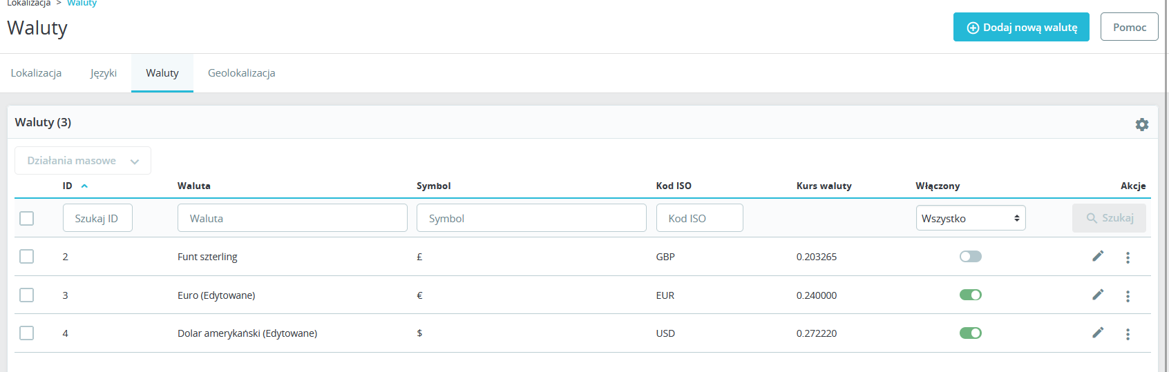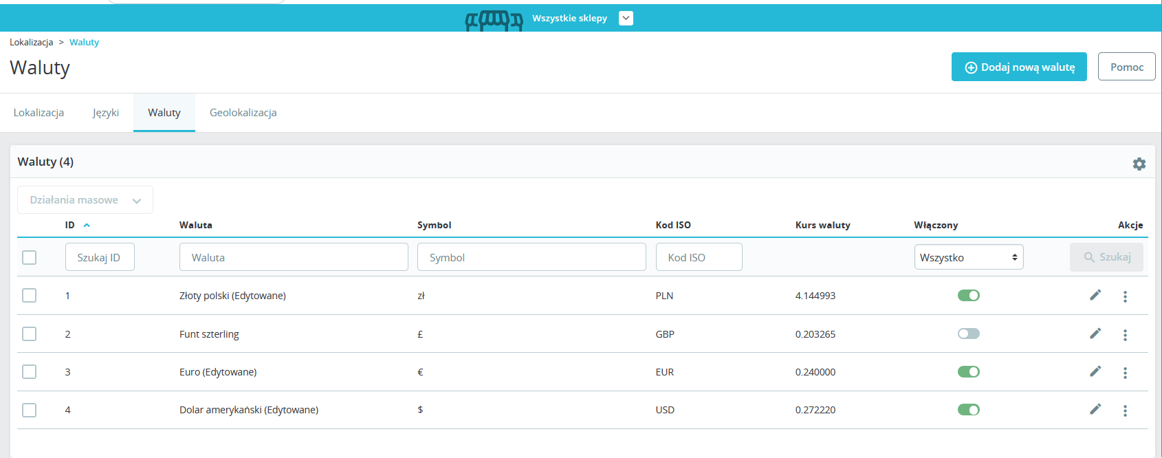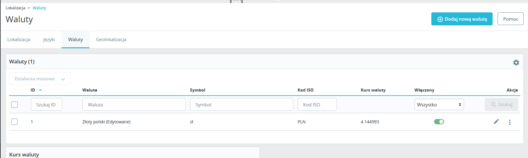 Waluta domyślna w kontekscie multistore to PLN, dla wersji polskiej to PLN a dla angielskiej to EUR.