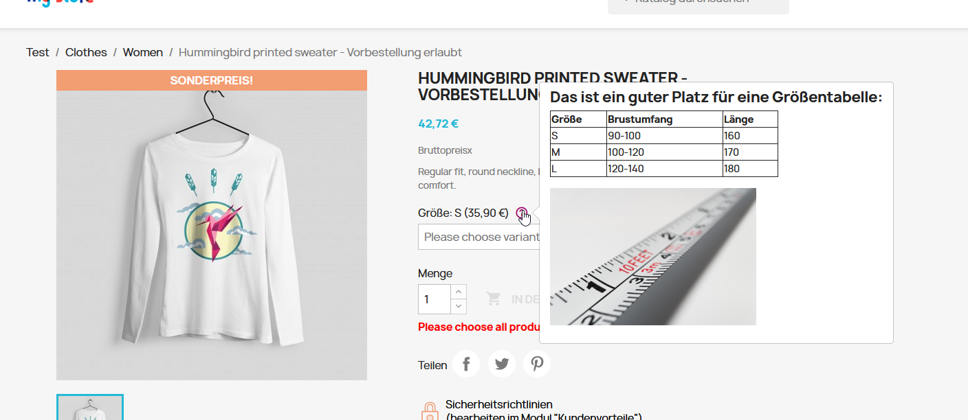 4presta Posted July 22 Share Posted July 22 Hallo. Es gibt mehrere Möglichkeiten. Sie können ein Größenbild in die ausführliche Produktbeschreibung einfügen, ein Modul verwenden, um unten auf der Seite einen neuen Tab zu erstellen und ein Größenbild hochzuladen. Alternativ können Sie eine HTML-Tabelle oder ein Popup-Fenster einfügen, das nach dem Klicken auf eine Schaltfläche, beispielsweise in der Kurzbeschreibung, erscheint. Sie müssen außerdem angeben, ob Sie die Schuhgrößen für alle oder nur für bestimmte Produkte anzeigen möchten. Die Größentabelle weiter unten auf der Seite zu platzieren, ist nicht optimal, da sich nur wenige Kunden die ausführliche Beschreibung oder die Produktmerkmale ansehen. Link to comment Share on other sites More sharing options...