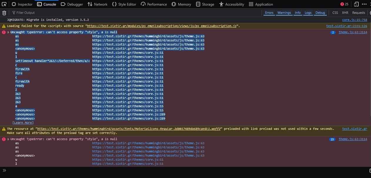 wigs Posted August 13 Share Posted August 13 (edited) I fresh installed prestashop 9, after a lot of trial and error it works but I get these css errors. Any idea how to fix them? I don't even know what's causing them/what should be happening instead of throwing the errors. My shop's url is alegro.gr (used to be test.sixtir.gr) Uncaught TypeError: can't access property "style", a is null as https://test.sixtir.gr/themes/hummingbird/assets/js/theme.js:63 as https://test.sixtir.gr/themes/hummingbird/assets/js/theme.js:63 as https://test.sixtir.gr/themes/hummingbird/assets/js/theme.js:63 <anonymous> https://test.sixtir.gr/themes/hummingbird/assets/js/theme.js:63 u https://test.sixtir.gr/themes/core.js:11 l https://test.sixtir.gr/themes/core.js:11 setTimeout handler*263/</Deferred/then/a/< https://test.sixtir.gr/themes/core.js:11 c https://test.sixtir.gr/themes/core.js:11 fireWith https://test.sixtir.gr/themes/core.js:11 fire https://test.sixtir.gr/themes/core.js:11 c https://test.sixtir.gr/themes/core.js:11 fireWith https://test.sixtir.gr/themes/core.js:11 ready https://test.sixtir.gr/themes/core.js:11 Z https://test.sixtir.gr/themes/core.js:11 263 https://test.sixtir.gr/themes/core.js:11 263 https://test.sixtir.gr/themes/core.js:11 263 https://test.sixtir.gr/themes/core.js:11 a https://test.sixtir.gr/themes/core.js:15 <anonymous> https://test.sixtir.gr/themes/core.js:15 <anonymous> https://test.sixtir.gr/themes/core.js:289 <anonymous> https://test.sixtir.gr/themes/core.js:289 Edited September 8 by wigs (see edit history) Link to comment Share on other sites More sharing options...