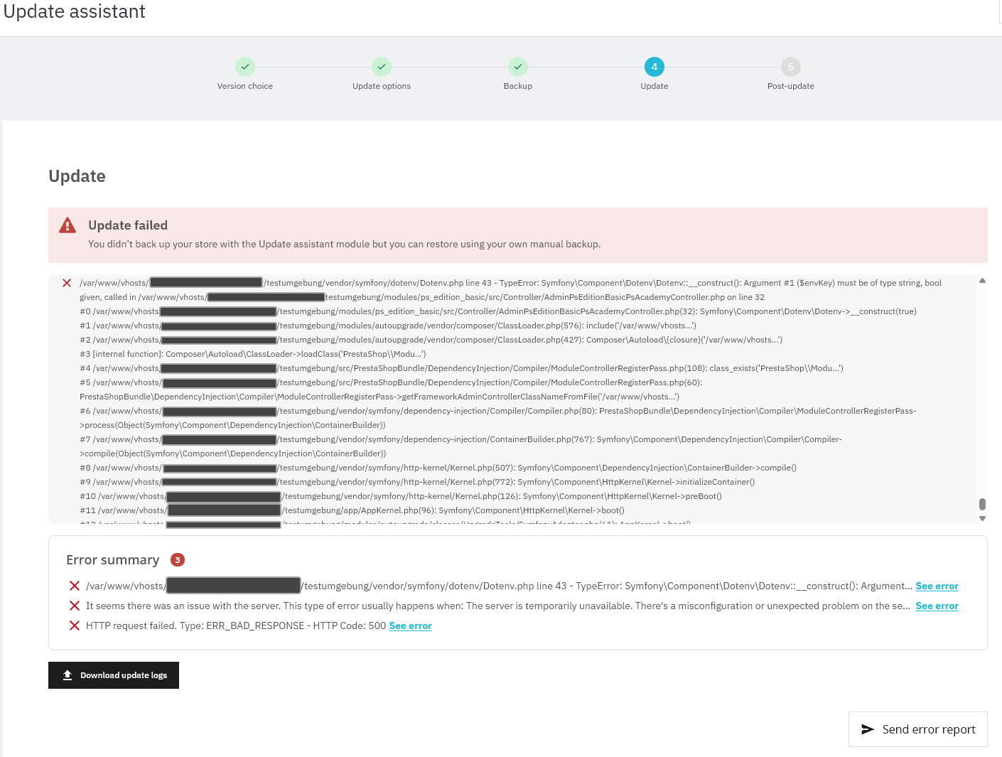 Chris_675 Posted August 25 Share Posted August 25 Hello, I received the following error while updating from v8.2.1 to 9.0.0: Quote /var/www/vhosts/%%%/testumgebung/vendor/symfony/dotenv/Dotenv.php line 43 - TypeError: Symfony\Component\Dotenv\Dotenv::__construct(): Argument #1 ($envKey) must be of type string, bool given, called in /var/www/vhosts/%%%/testumgebung/modules/ps_edition_basic/src/Controller/AdminPsEditionBasicPsAcademyController.php on line 32 bool instead of string? can I find and correct envKey? additional: Quote It seems there was an issue with the server. This type of error usually happens when: The server is temporarily unavailable. There's a misconfiguration or unexpected problem on the server. HTTP request failed. Type: ERR_BAD_RESPONSE - HTTP Code: 500 It seems as if the first mistake is the most serious one. The folders and files associated with ‘Dotenv’ are imported for the first time during the update and appear to be a new feature in version 9. My Serverconfig: Serverdaten Serverdaten Linux #1 SMP Thu Jun 1 16:49:27 UTC 2023 x86_64 Version der Server-Software Apache PHP-Version 8.1.19 Speichergrenze 768M max_execution_time: 900 Upload (max. Dateigröße) 256M Datenbank MySQL-Version 8.0.26-16 MySQL-Server 127.0.0.1:3307 Tabellen-Präfix: ps_ MySQL-Engine MySQL MySQL-Treiber DbPDO Shop-Einstellungen PrestaShop-Version 8.2.1 Thanks for following help Link to comment Share on other sites More sharing options...
