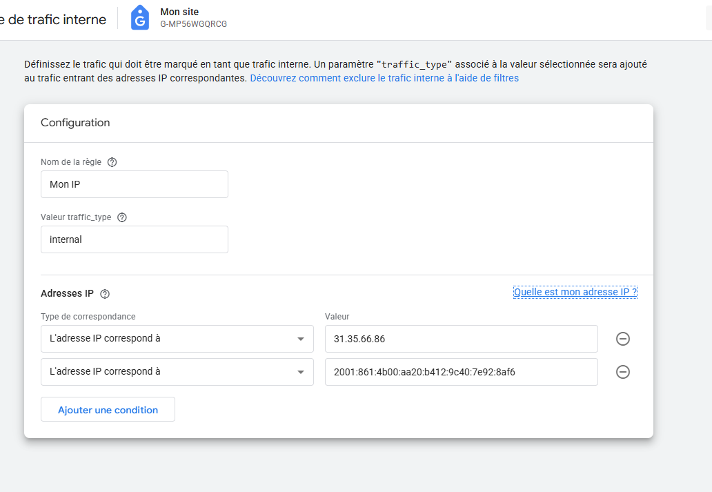 Prestashop Addict Posted 58 minutes ago Share Posted 58 minutes ago (edited) Dans GA4 cliquez sur Cliquez sur votre flux de données Web Puis sur Puis cliquez sur Afficher plus puis Et là vous créez votre règle de filtre avec votre ou vos IP Edited 56 minutes ago by Prestashop Addict (see edit history) Link to comment Share on other sites More sharing options...