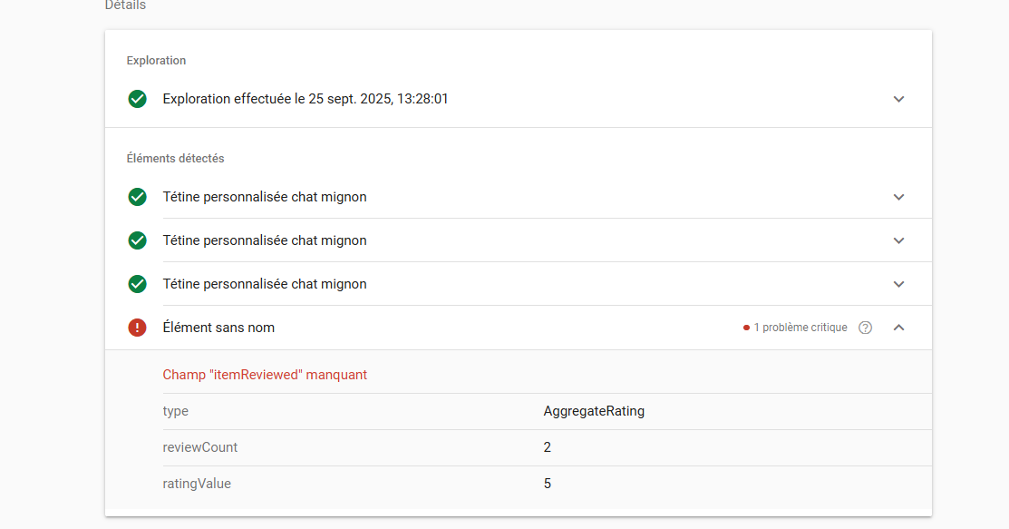 freds83 Posted September 25 Share Posted September 25 Bonjour je rencontre une erreur critique Itemreviewed manquant J'ai fouillé le forum français et anglais mais je n'ai pas trouvé de solution Si une âme charitable passe par ici et peux m'aiguiller Version prestashop 1.7.8.11 url: https://sucette-perso.fr/tetine-bebe-animaux/1529-tetine-personnalisee-chat-mignon.html En attendant bon après midi et merci d'avoir pris le temps de me lire Link to comment Share on other sites More sharing options...