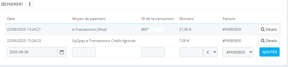 J’ai remarqué que, pour certains paiements via Up2Pay e-Transactions (Crédit Agricole), le montant est scindé en deux. Le souci est que les 7 € de frais de livraison ne me sont pas versés :