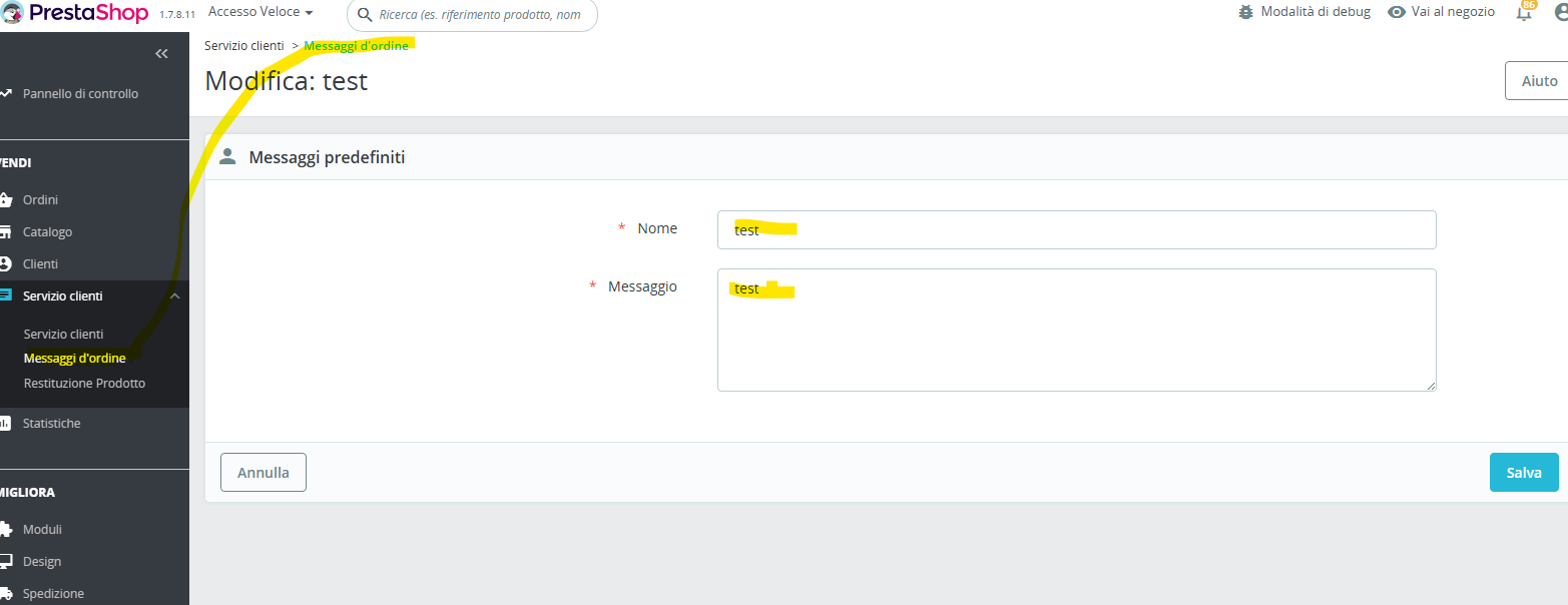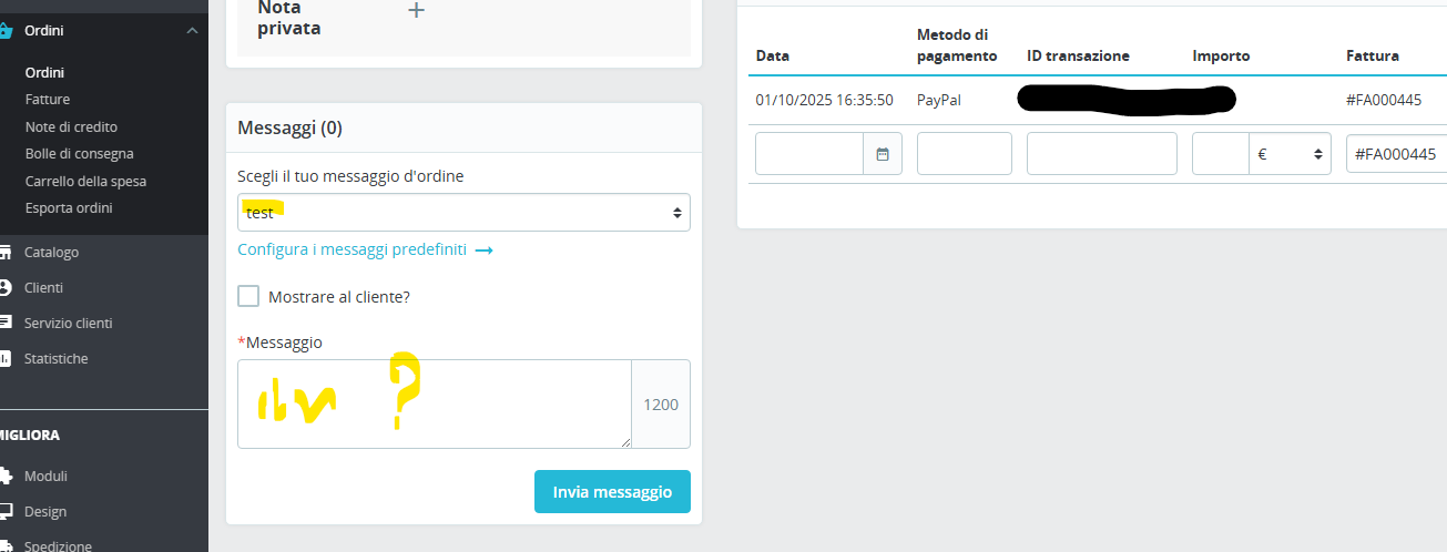 braccetto78 Posted yesterday at 03:33 PM Share Posted yesterday at 03:33 PM salve a tutti - ho recentemente migrato su ps 1.7.8 importando tutto - non sono su tema di default ma installato un tema free ho un problema con i messaggi d'ordine nel backoffice dell'ordine (quelli che si creano ed inviano al cliente), che non vengono caricati dal menu a tendina. anche creandone uno nuovo ho lo stesso problema. il titolo del messaggio c'è, ma selezionadolo dal menu a tendina non viene visualizzato il suo contenuto. a qualcuno è mai successo? quale template o controller è responsabile di questi messaggi? grazie a tutti mi aiutino saluti Link to comment Share on other sites More sharing options...