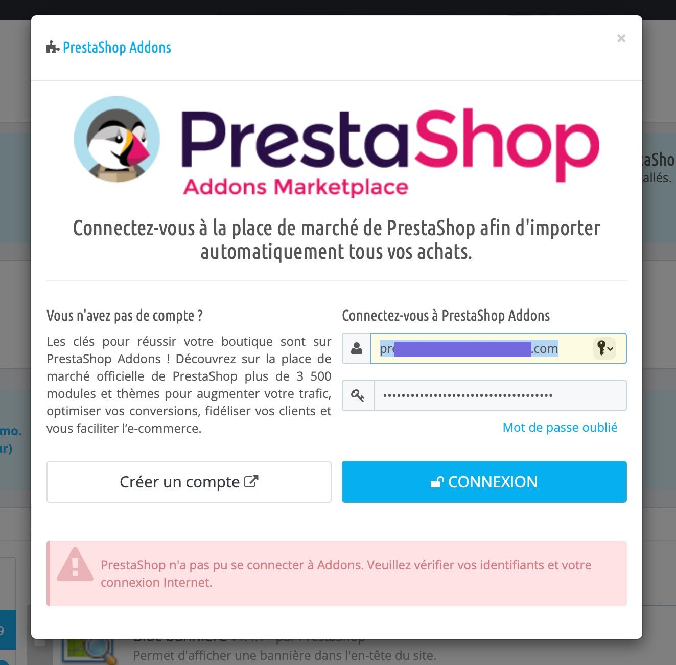 Jef.b Posted 14 hours ago Share Posted 14 hours ago (edited) Bonjour, sur prestashop 1.6.1, coté admin, je n'arrive pas à me connecter à mon compte "prestashop addons" (=> "PrestaShop n'a pas pu se connecter à Addons. Veuillez vérifier vos identifiants et votre connexion Internet"). Alors que mes identifiants et mots de passe sont bons (je me connecte sans problème en allant sur la page addons prestashop) Edited 13 hours ago by Jef.b (see edit history) Link to comment Share on other sites More sharing options...