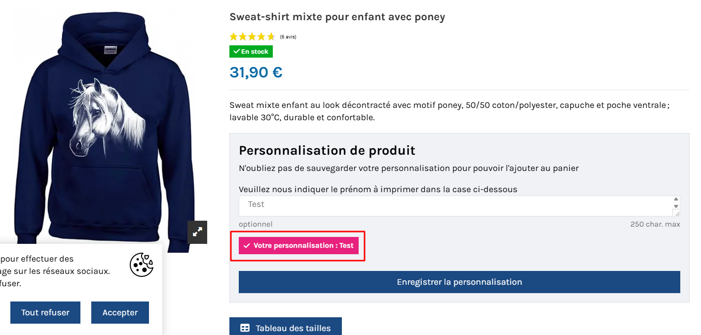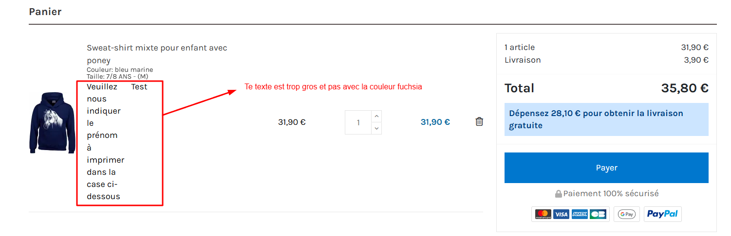 arm15 Posted 3 hours ago Share Posted 3 hours ago Bonjour, J'ai une boutique sur PrestaShop v 8.2 avec comme thème "Warehouse". https://locomotif-shop.com/ Je ne sais pas si c'est ici qu'il faut que je poste, je tente le coup 🙂 Je souhaiterais, après que l'on a indiqué le prénom dans la partie personnalisation, que les clients voient dans le panier le prénom qu'il souhaite et si possible en rose fuchsia. Je vous joins des screenshots avec explications. Dans l'attente d'une réponse, cordialement, Armand Link to comment Share on other sites More sharing options...