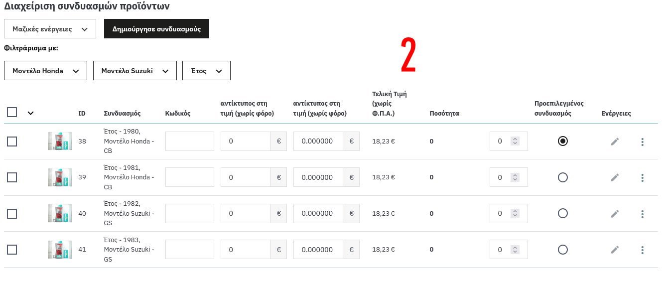 maniakpresta Posted 7 hours ago Share Posted 7 hours ago (edited) Γεια σας στο forum. Επιστρέφοντας στο Prestashop μετά από χρόνια έστησα το 8 για την αναβάθμιση παλιότερης έκδοσης. Έχω το παρακάτω πρόβλημα. Σε δημιουργία combination προϊόντος για μοτοσυκλέτες, έστω ότι αυτό το προϊόν Κάνει για Μοντέλο HONDA = CB του 1980 και 1981 Αλλά και για Μοντέλο SUZUKI = GS του 1982 και 1983 Στην δημιουργία συνδυασμών παράγετε το παρακάτω. 1. Μοντέλο HONDA - CB, Έτος – 1980 2. Μοντέλο HONDA - CB, Έτος – 1981 3. Μοντέλο SUZUKI - GS, Έτος – 1982 4. Μοντέλο SUZUKI - GS, Έτος – 1983 (Δείτε επισυναπτόμενη εικόνα 2.jpg) ------------------------------------------------------------ Στο page του προϊόντος εμφανίζετε μόνο το 1. Μοντέλο HONDA - CB, Έτος – 1980 2. Μοντέλο HONDA - CB, Έτος – 1981 (Δείτε επισυναπτόμενη εικόνα 3.jpg) ---------------------------------------------------------------------------- Οι ιδιότητες που έχουν δημιουργηθεί στο Ιδιότητες & Χαρακτηριστικά είναι 1. Ιδιότητες = Μοντέλο Honda, τιμή = CB , XR, 2. Ιδιότητες = Μοντέλο Suzuki, , τιμή = GS, RM, 3. Ιδιότητες = Έτος τιμή = 1980, 1981, 1982, 1983 (Δείτε επισυναπτόμενη εικόνα 1.jpg) ------------------------------------------------------------------------ Δεν μπορούν να γίνουν πια συνδυασμοί τέτοιου τύπου? Edited 7 hours ago by maniakpresta (see edit history) Link to comment Share on other sites More sharing options...