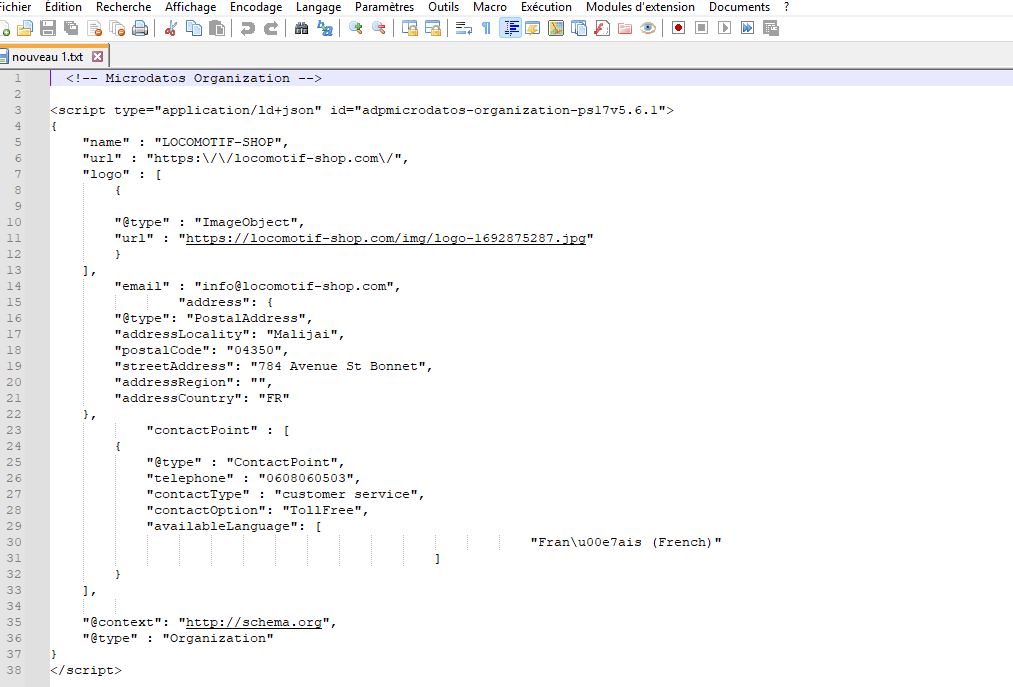 Eolia Posted 8 hours ago Share Posted 8 hours ago Exemple chez moi "contactPoint" : [{ "@type" : "ContactPoint", "url": "https:\/\/presta.devcustom.net\/nous-contacter", "contactType" : "customer service", "areaServed": "FR", "availableLanguage": ["Fran\u00e7ais (French)","English (United States)"] }] Link to comment Share on other sites More sharing options...