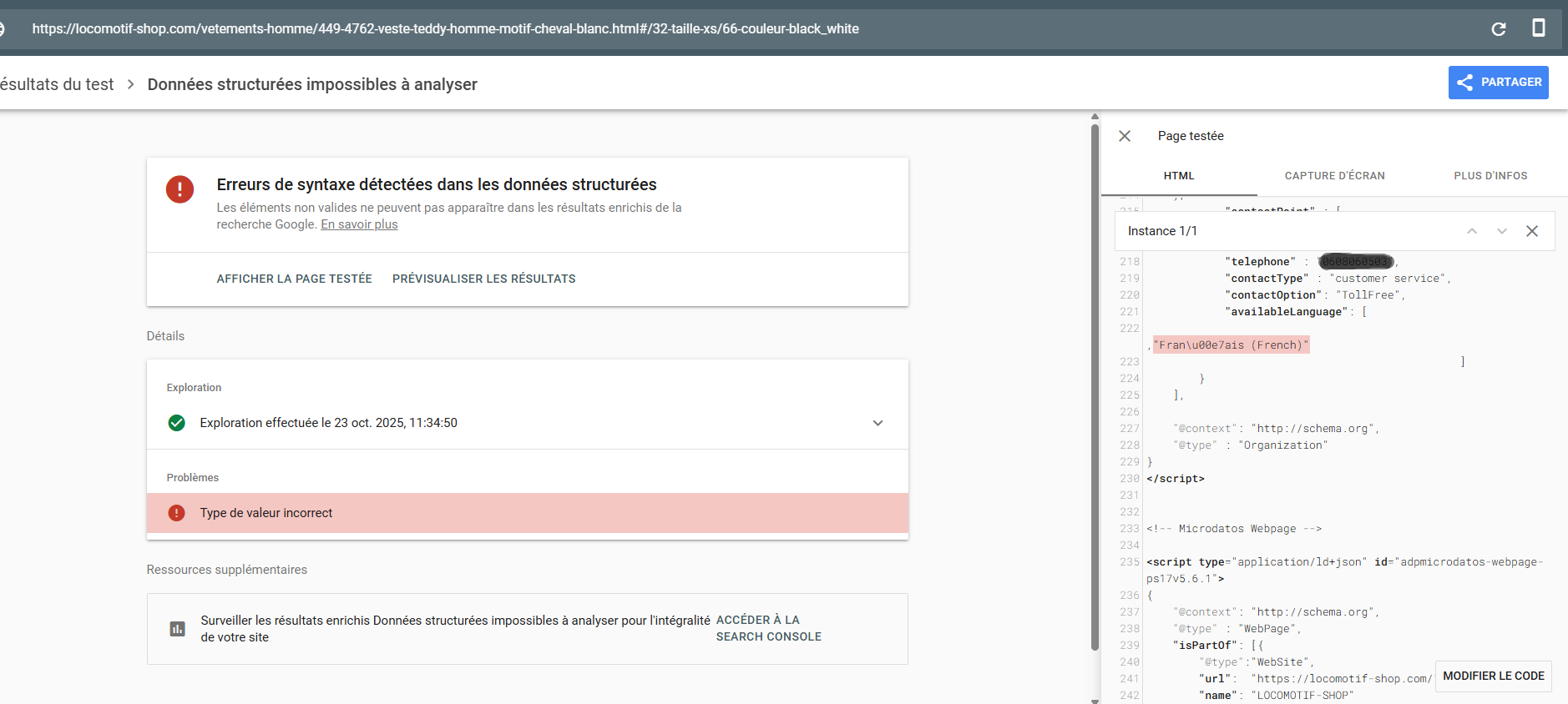 arm15 Posted 4 hours ago Author Share Posted 4 hours ago (edited) 3 hours ago, Eolia said: il y a une virgule en trop avant "Fran\u00e7ais (French)" Vous avez raison, c'est bien la virgule qui est en trop. Je viens de tester le code sur "shema.org" sans la virgule... Tout est clean ! J'ai envoyé un message au développeur, cela fait 3H environs, il doit faire la sieste, il est espagnol. Avez-vous la possibilité de m'aider ? Edited 4 hours ago by arm15 (see edit history) Link to comment Share on other sites More sharing options...
