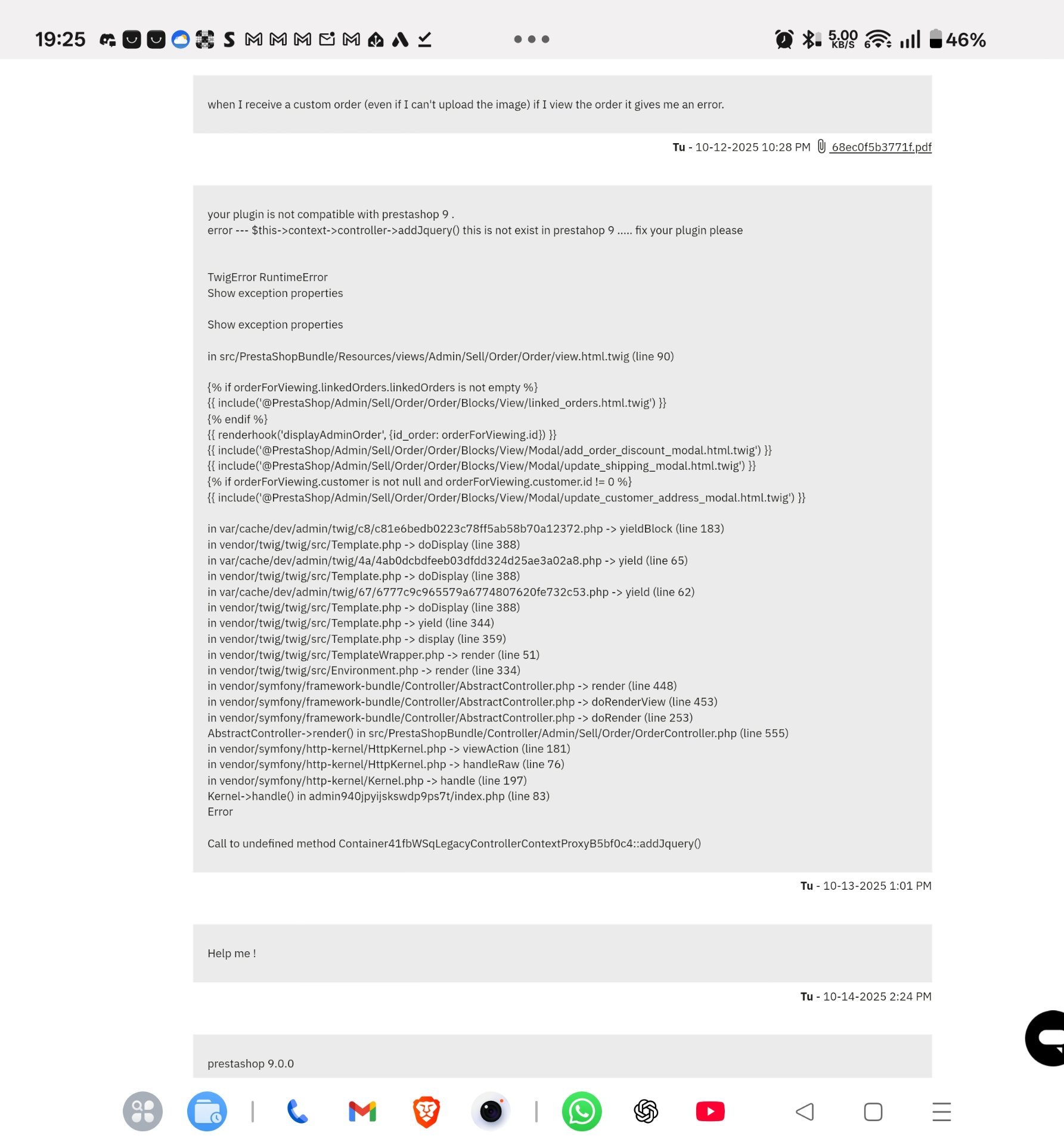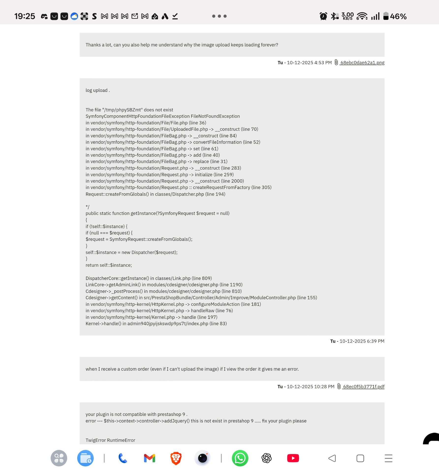 Essedesignshop Posted Sunday at 06:23 PM Share Posted Sunday at 06:23 PM (edited) Salve a tutti , ho acquistato il modulo https://addons.prestashop.com/en/product-variants/22677-product-customization-designer-custom-product-design.html?search_query_id=20d0728cca51c892f1f3c106aa0db89c&search_index=Products_EN_relevance Per personalizzare i prodotti, ma nonostante dichiari che sia compatibile con ps9 , ciò non lo è. Qui inizia il calvario , centinaia di messaggi allo sviluppatore via ticket sul sito , dopo 1 o due risposte che accedono al sito non risolvono manco loro e spariscono , assistenza prestashop 0 , sto seriamente pensando di rimanere su shopify perché se sposto il mio e-comerce su ps9 ed è questa l assistenza dopo aver speso 240 euro +iva per un solo modulo e questi sono i risultati non metto a rischio la mia azienda , e mai possibile che ps9 abbia questo schifo ? Logicamente installazione pulita PHP 8.3 come da Documentazione sia del plugin che ps9 , provato sia ps9 che ps9.0.1 , il problema che appena installo il plugin , il sito va in modalità debug e mi dà errori a non finire . Allego l' errore che da , estratto dal ticket ormai abbandonato che ho aperto . Edited Sunday at 06:26 PM by Essedesignshop Screen (see edit history) Link to comment Share on other sites More sharing options...