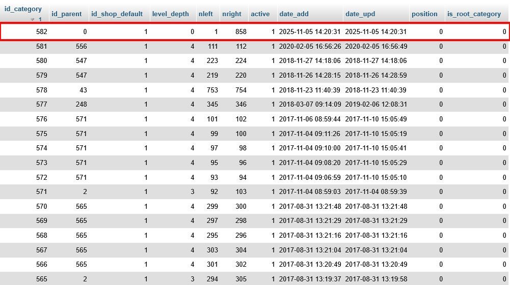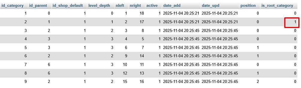 maniakpresta Posted November 6 Share Posted November 6 Hello. We migrated from Prestashop 1.3 to Prestashop 8. We discovered that we cannot manage the add or edit of categories to products. What we saw is that in the 1.3 database, category 1 is (HOME) and (root). In the Prestashop 8 database, category 2 is (HOME) and (root). In the database of 8 after the migrate, category 1 is (root) and category 2 is (HOME) Also, category 1 has id_parent (582), a category created during migration that did not exist in 1.3 and is not processed in the Prestashop back end (The object cannot be loaded (or found). First of all, I would like to ask if it is possible to migrate from Prestashop 1.3 to 8 and if there is a solution to the above problem. Thank you. Link to comment Share on other sites More sharing options...