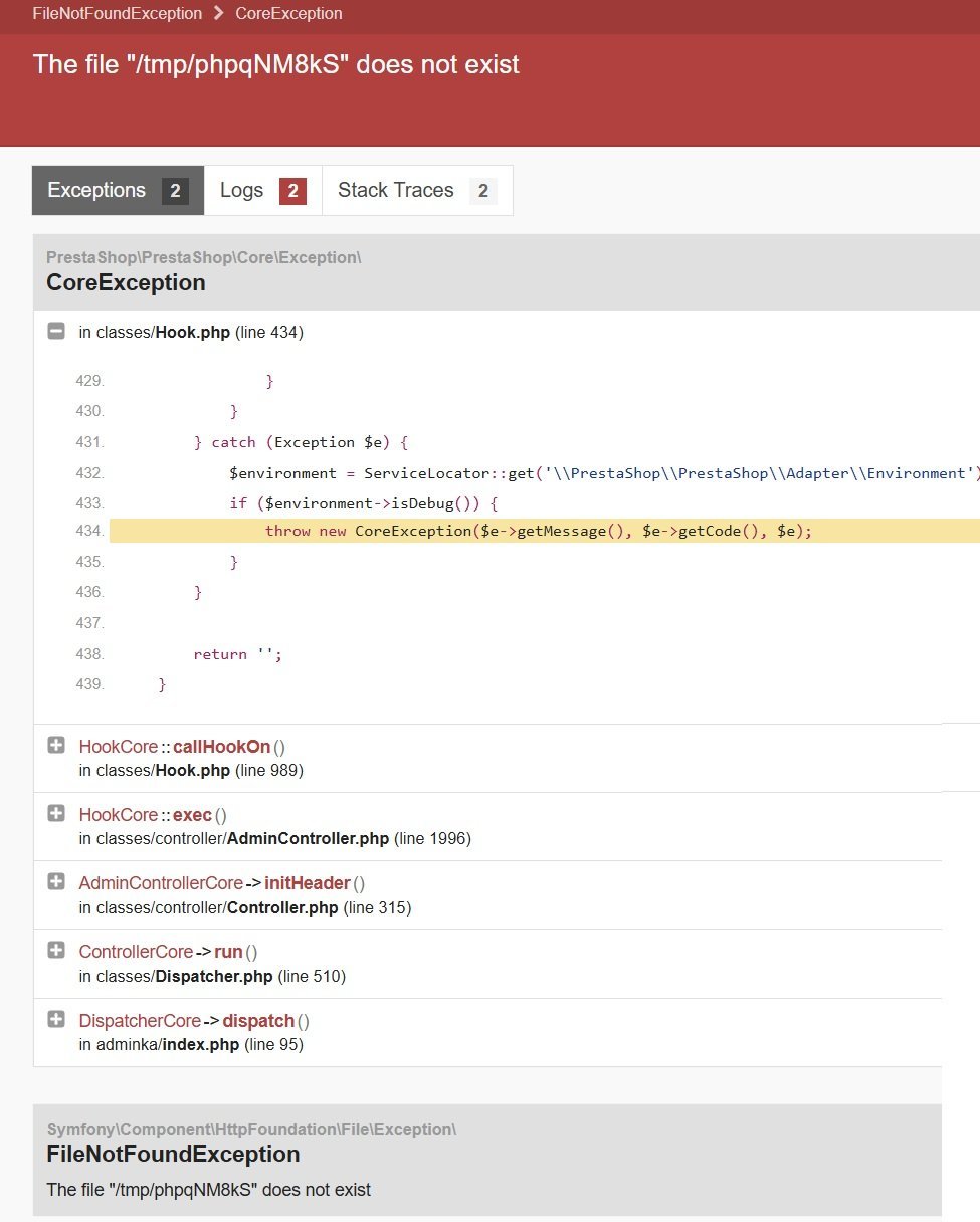 musicmaster Posted yesterday at 02:21 PM Share Posted yesterday at 02:21 PM (edited) When I change an image in the topmenu program of my template I get the error "The file "/tmp/phpnWYRUf" does not exist" with the file name every time different but always starting with /tmp/php. The pictture is at the bottom. The location of the code indicates that the error happens in a hook. Adding some debug code produced that it happens in the autoupgrade module in the displayBackofficeHeader hook. The relevant code in the autoupgrade module looks so: public function hookDisplayBackOfficeHeader() { if (!$this->initAutoloaderIfCompliant()) { return ''; } if (isset($this->context->controller->ajax) && $this->context->controller->ajax) { return ''; } return (new \PrestaShop\Module\AutoUpgrade\Hooks\DisplayBackOfficeHeader($this->getUpgradeContainer()))->renderUpdateNotification(); } Does anyone know how to solve this? In the error log file under /var/logs I find the following two errors Quote [2025-12-17 14:38:27] php.CRITICAL: Uncaught Exception: The file "/tmp/phpnWYRUf" does not exist {"exception":"[object] (PrestaShop\\PrestaShop\\Core\\Exception\\CoreException(code: 0): The file \"/tmp/phpnWYRUf\" does not exist at /var/www/html/staranova/classes/Hook.php:434, Symfony\\Component\\HttpFoundation\\File\\Exception\\FileNotFoundException(code: 0): The file \"/tmp/phpnWYRUf\" does not exist at /var/www/html/staranova/vendor/symfony/symfony/src/Symfony/Component/HttpFoundation/File/File.php:36)"} [] [2025-12-17 14:38:27] request.CRITICAL: Uncaught PHP Exception PrestaShop\PrestaShop\Core\Exception\CoreException: "The file "/tmp/phpnWYRUf" does not exist" at /var/www/html/staranova/classes/Hook.php line 434 {"exception":"[object] (PrestaShop\\PrestaShop\\Core\\Exception\\CoreException(code: 0): The file \"/tmp/phpnWYRUf\" does not exist at /var/www/html/staranova/classes/Hook.php:434, Symfony\\Component\\HttpFoundation\\File\\Exception\\FileNotFoundException(code: 0): The file \"/tmp/phpnWYRUf\" does not exist at /var/www/html/staranova/vendor/symfony/symfony/src/Symfony/Component/HttpFoundation/File/File.php:36)"} [] The File.php Symfony file contains this (summarized): class File extends \SplFileInfo { /** * Constructs a new file from the given path. * @throws FileNotFoundException If the given path is not a file */ public function __construct(string $path, bool $checkPath = true) { if ($checkPath && !is_file($path)) { throw new FileNotFoundException($path); } parent::__construct($path); } It throws the FileNotFoundException. The original error looks so: Edited yesterday at 07:43 PM by musicmaster (see edit history) Link to comment Share on other sites More sharing options...