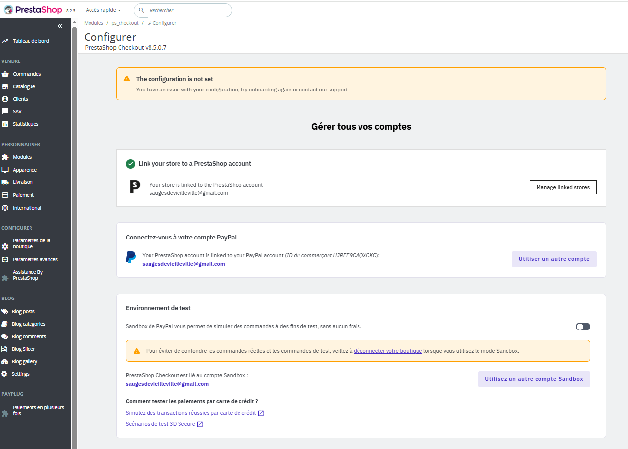 TimoDB Posted Wednesday at 10:50 PM Share Posted Wednesday at 10:50 PM Bonsoir à tous, Je suis un petit nouveau sur Prestashop, j'ai fraîchement lancé mon activité en 2025, et après avoir pratiqué l'outil pendant 3 ans dans une boîte précédente, je me suis naturellement tourné vers le même. Mais voilà je rencontre un problème assez embêtant : mon module Prestashop Checkout m'a fait arracher mes cheveux sur ces 2 derniers jours Impossible de faire apparaître les moyens de paiement au moment de passer commande ! Alors je précise plusieurs choses, parce que c'est dense : Version Prestashop 8.2.3 Version Prestashop Checkout 8.5.0.7 Le module a déjà été installé avant la version en question, et les moyens de paiement apparaissaient ! Cependant, ça mettait une erreur "Une erreur s'est produite lors du paiement. Veuillez réessayer ou contacter le support." Donc en cherchant la solution, j'ai vu une MaJ du module : Clic, je la fais. Et depuis, après avoir fait la configuration aussi exhaustive possible, tout comme précédemment d'ailleurs, impossible de faire apparaître ces moyens de paiement, et une indiciation "The configuration is not set" vient compléter le tableau, alors que je ne vois vraiment pas ce que je pourrais ajouter... Ah, et entre temps une manipulation m'a même basculé le dashboard en erreur globale, contraint de passer en Debug pour corriger le souci (désinstaller totalement le module, tiens donc) Je précise aussi que j'ai check les préférences de moyens de paiement, la bonne liaison entre Paypal et Prestashop, etc. Je m'intéresse précisément au mode de paiement par Carte. Je suis assez perplexe et décontenancé. En faisant des recherches sur le forum, j'ai vu plein de soucis avec ce module, mais rien d'aussi actuel, avec cette version-là... Je suis plutôt débrouillard mais débutant voire néophyte pour certains aspects du code, alors je m'attends à tout en termes de pistes/réponses ! Je vous remercie beaucoup de m'avoir lu, je me mets en parallèle en cours de config avec Stripe au cas où ce soit insoluble Bonne soirée ! Timothée Link to comment Share on other sites More sharing options...
