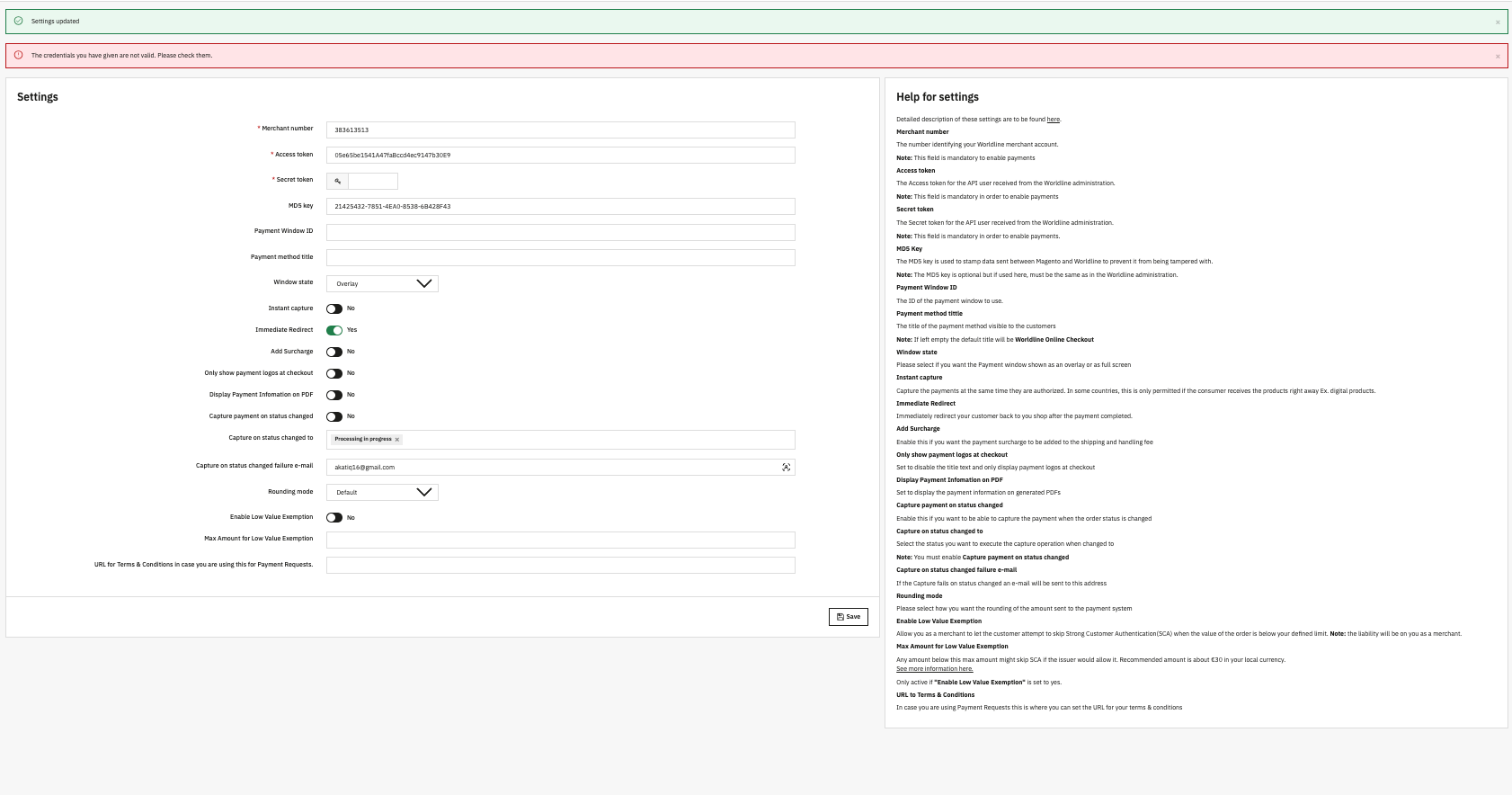 wepresta Posted 1 hour ago Share Posted 1 hour ago Hello, From your screenshot the red message is the key: “The credentials you have given are not valid.” So the module can reach Worldline, but the API credentials don’t match. Quick checks: Make sure you’re using the correct environment Test/Sandbox vs Live (keys must match the environment). Regenerate and re-copy Access token / Secret token / HMAC(HDS) key (no extra spaces/line breaks). Verify the Merchant number matches the account that generated those keys. Check outbound access isn’t blocked (WAF/Cloudflare/mod_security/firewall). Link to comment Share on other sites More sharing options...