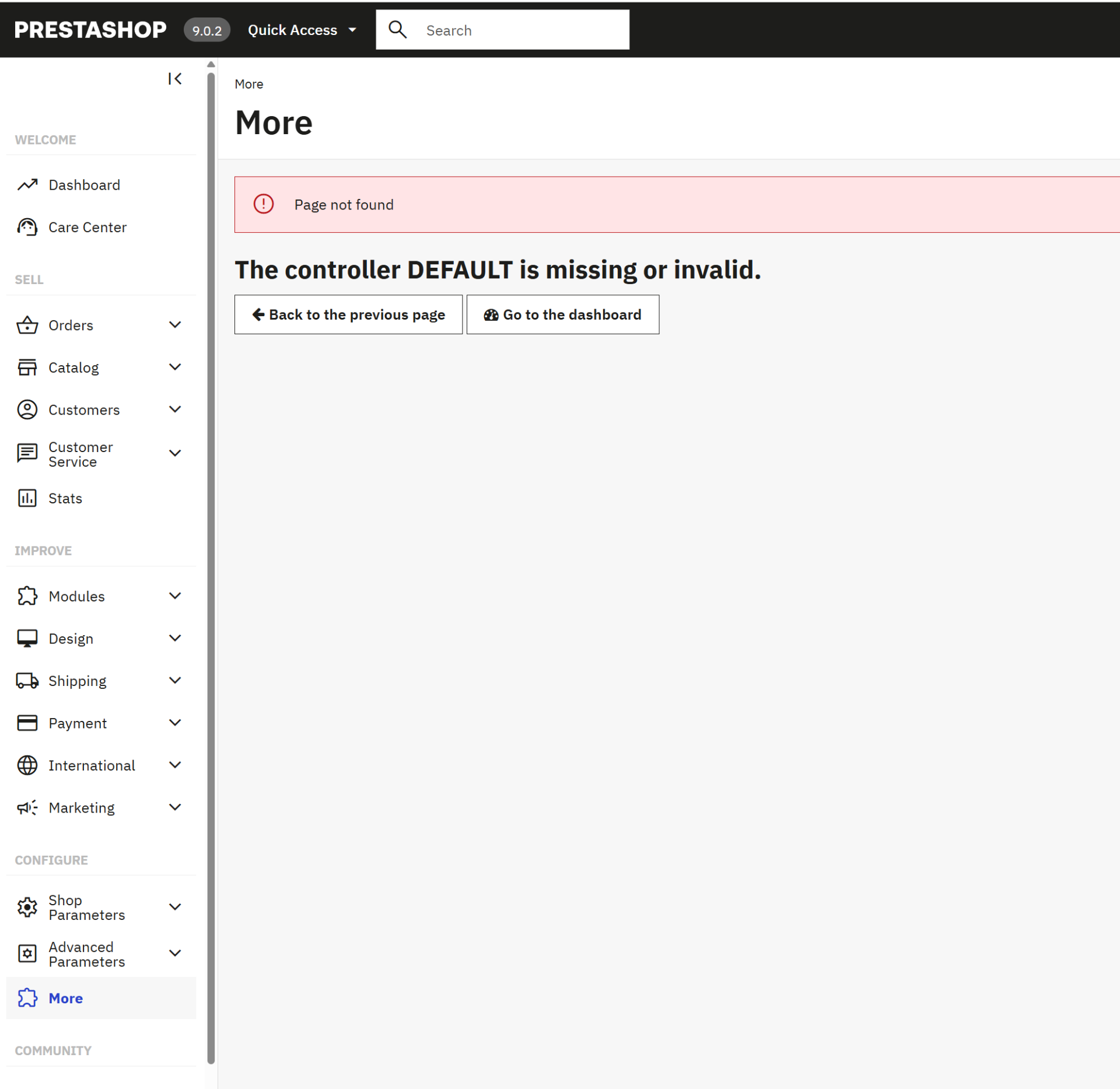 IXL Posted 22 hours ago Share Posted 22 hours ago (edited) PRETASHOP (SOFTACULOUS INSTALL) - ADMIN PAGE > CONFIGURE > MORE "The controller DEFAULT is missing or invalid." Hi, Forgive me if I am posting in the wrong section. English is my first language too. I have installed Prestashop, via Softaculous to try out first and I am REALLY liking what I am seeing. I have setup most of the store fine, but wondered if you can help on the above and attached error please? In the Admin section, within Configure, the "More" section reports of a missing file. Is this a bug / known issue? See attached. I am somewhat confused why this was reported elsewhere but seems to be re-occuring for a lot of people. Is there a permanent solution at all ? Thank you Edited 22 hours ago by IXL (see edit history) Link to comment Share on other sites More sharing options...