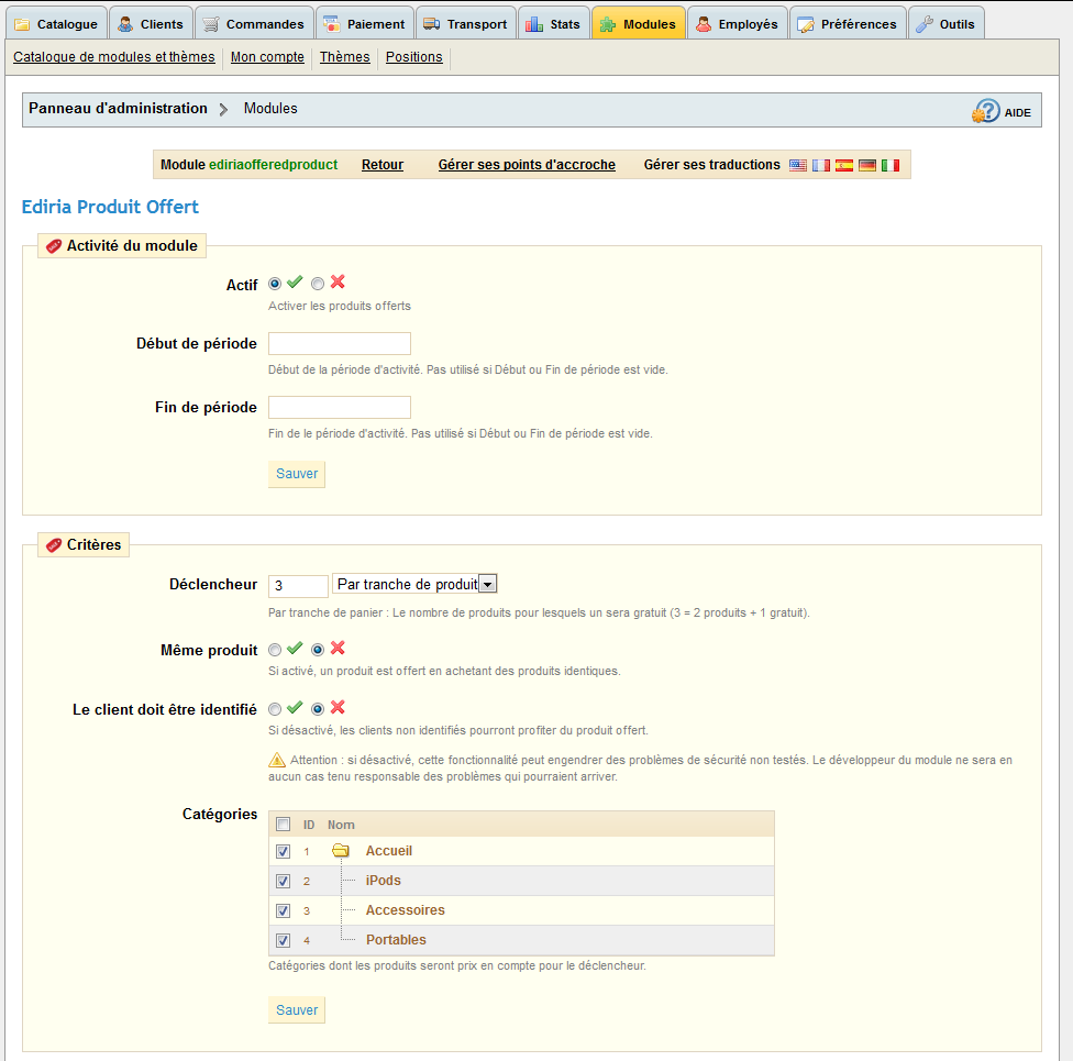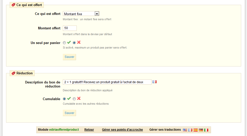 Antoine Dubois Posted June 17, 2011 Share Posted June 17, 2011 Bonjour, Voici mon dernier module, Ediria Offered Product (compatible PS 1.3 et 1.4) MAINTENANT DISPONIBLE EN VERSION 1.3. Ce module vous permet d'appliqer une technique de vente bien connue, à savoir "Un produit gratuit à l'achat de deux" (ou de x produits). Une excellente fonctionnalité marketing surtout à l'approche de la période des soldes. Il ajoute automatiquement un bon de réduction dont le montant est calculé en fonction du nombre de produits dans le panier. Vous choisissez si le produit offert est le moins cher, le plus cher ou entre les deux. Vous choisissez le nombre de produits à partir duquel un produit est offert. Vous pouvez activer ou désactiver simplement le module sans le désinstaller pour le faire fonctionner qu'en période de solde par exemple. Version 1.1: Planificateur pour l'activation du module Version 1.2: Différents critères pour déclencher la réduction : quantité de produit ou montant du panier Différents types de produit offert : produit dans le panier, montant fixe ou cadeau gratuit Les produits peuvent être limités par catégories Choisissez un pourcentage du produit qui est offert Vous pouvez limiter par achat de produit identique : 2 + 1 ipods au lieu de 2 + 1 produit Version 1.3: Option pour décider si le client doit être connecté ou non pour profiter du produit offert. Offrez un pourcentage du panier. Passez à l'étape suivante en matière de solde avec Ediria Offered Product. !!! Important !!! Des modifications sur les fichiers ne sont necessaires que si votre version de Prestashop est inférieure à 1.3.2.3. Vous trouverez ce module sur le site de Prestashop en suivant ce lien : Ediria Offered Product A votre service Antoine Dubois Link to comment Share on other sites More sharing options...