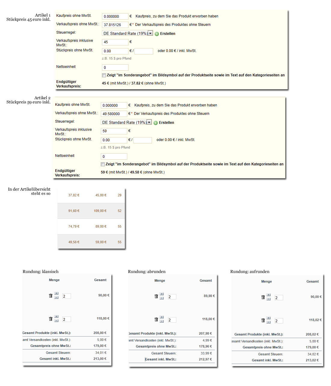 mayabaya Posted August 5, 2011 Share Posted August 5, 2011 Bei mir verrechnet er sich auch! Version 1.4.2.5 im Warenkorb und auf Rechnung tückisch ist, dass sich der Shop nicht immer verrechnet. Aber mit diesen Artikel Preisen (2x45 und 2x 59 Euro) erhalte ich je nach Rundungsregel (Klassisch, Auf- und Abrunden) 3 Unterschiedliche Ergebnisse. - Klassisch liefert ein FALSCHES Ergebnis !!! !!! - Auf- und Abrunden verändert die Artikel-Bruttopreise und ich kann sie NICHT wieder auf den gewünschten Preis von genau 59 Euro ändern!!! Wie auf den Bildern im Anhang zu sehen. Prestashop das wars!( (Es sei denn mir erklärt jemand, dass ich was falsch mache) Link to comment Share on other sites More sharing options...