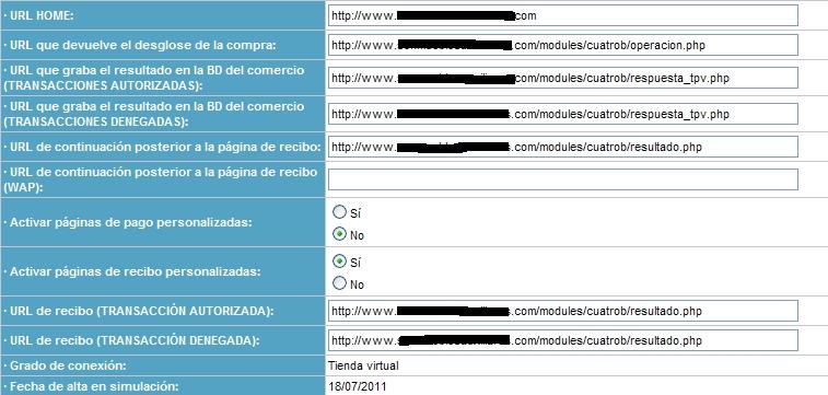 azoque Posted August 5, 2011 Author Share Posted August 5, 2011 EFECTIVAMENTE! a veces uno se empeña en ver el árbol que no ve el bosque, tan empeñado estaba en la configuración que no me había dado cuenta que debía dejar entrar a 4b!!! RESUMEN PARA CONFIGURAR 4b: modulo 4b, en back poner el codigo de 4b PIxxxx la configuración de 4b cómo el pantallazo adjunto permisos al modulo por ftp: 777 ABRIR la tienda, dejarla activa para dejar pasar a la pasarela de 4b probar pasarela num de targeta: 123456 fecha: superior a la actual codigo: 111 no olvidar volver a dejar inactiva la tienda si os quedan retoques Al activar la tienda activar la pasarela y salir del modo pruebas en módulo 4b. gracias, muchas gracias Es mucho más sencillo que eso. Tienes la tienda en modo mantenimiento, con lo cual, cualquier intento de acceso del banco a tu página te generará un error 503. De ahí el error que comentas. Si quitas el modo mantenimiento ¡te funcionará sin problemas! ¡Prueba y comentanos! Link to comment Share on other sites More sharing options...