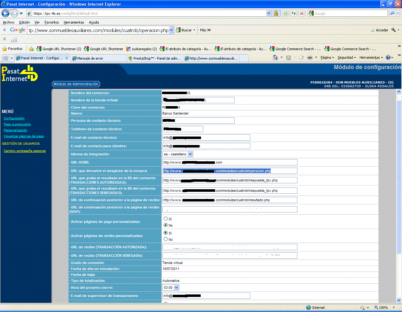 azoque Posted August 5, 2011 Author Share Posted August 5, 2011 dame más datos, pantallazos de configuración, etc. Tambien envia un pantallazo de la configuración del panel de 4b. en el back de prestashop, modulos/cuatrob/configurar solo pongo el PIxxxxxxx, banco santander. Uso el tema "Moderno". He estado viendo el enlace http://www.todoprestashop.com/foro/viewtopic.php?f=12&t=2677&hilit=tpv pero sin éxito. Muchas gracias por ayudarme! Link to comment Share on other sites More sharing options...