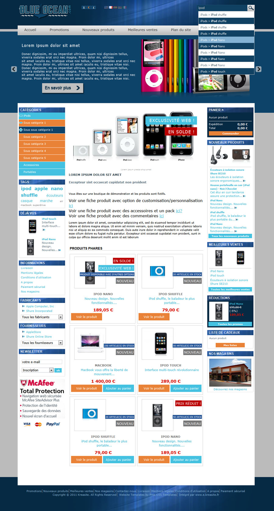 Kreasite Posted August 16, 2011 Share Posted August 16, 2011 Bonsoir, Voici un petit retour aux sources avec le thème Blue Ocean en 3 colonnes. Le logo se gère dans le Back Office. Les images et les liens du diaporama d'Olivier LE CORRE (olcjqueryslider) de la page d'accueil se changent dans le Back Office. Les quantités produits sur la page d'accueil ainsi que sur les pages Catégories sont affichées (possibilité de ne pas afficher cette fonction). Agrandissement du google map, etc... Un lien pour un accès rapide à la catégorie parente est présent sur les fiches produits. Le thème est une intégration d'un thème css de templatemo visible ici Ce thème est compatible Live Edit. Le thème complet + le module olcjqueryslider est 100% valide au test du validateur PrestaShop. Ce thème est configuré automatiquement dés lors que vous utilisez le module d'import themeinstallator présent en natif sur la version 1.4. Le thème est compatible avec les navigateurs suivants et même IE6 : FireFox 2.x, (3.x, 4.x, 5.x et 6 (CSS3)) Internet Explorer 7 (CSS2.1) Internet Explorer 8 (CSS2.1) Internet Explorer 9 (CSS3) Chrome de 4 à 13.x (CSS3) Chromium de 3 à 15.x (CSS3) Opera 9.x, (10.x et 11.x (CSS3)) Safari 4.x et 5.x (CSS3) Démo visible ici La fiche du produit est visible ici Link to comment Share on other sites More sharing options...