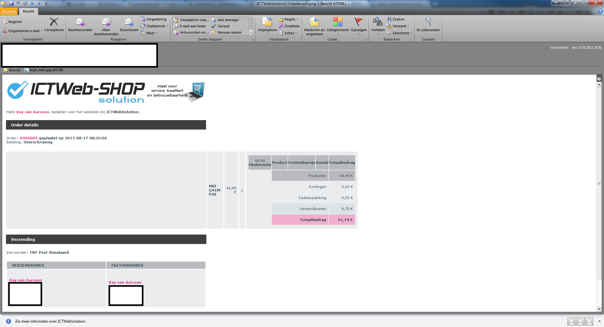 Kay van Aarssen Posted August 18, 2011 Author Share Posted August 18, 2011 Maakt helaas nog geen verschil uit. Heb is dat het enige wat er anders is aan jou HTML code van de orderbevestiging mail? Link to comment Share on other sites More sharing options...