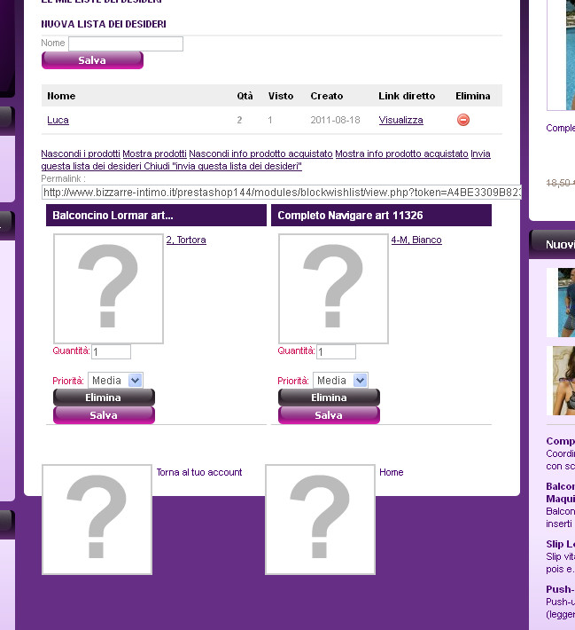 rodolo Posted August 18, 2011 Share Posted August 18, 2011 Salve,premetto non sono molto esperto di Prestashop. Stò utilizzando un tema personalizzato dove ho inserito il modulo "Lista dei Desideri", in locale il modulo funziona perfettamente mentre messo on line le miniature del modulo sono più grandi e l'immagine è diventata un punto interrogativo. C'è qualcuno che può indicarmi come risolevere il problema ? Grazie. Link to comment Share on other sites More sharing options...