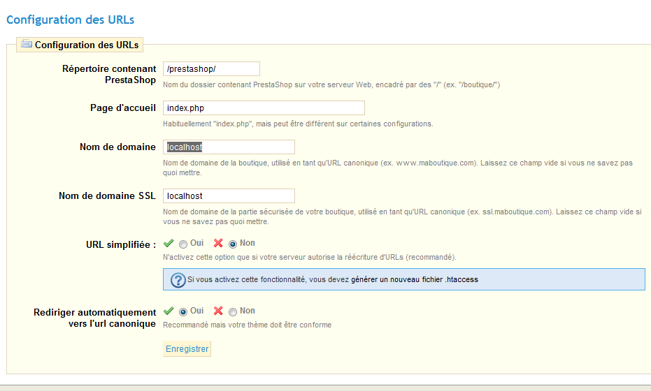 Claw Posted August 23, 2011 Author Share Posted August 23, 2011 Je n'avais pas vu ta réponse pouicpouic, j'échangeais avec mon hébergeur sur le problème qui est d'ailleurs maintenant résolu ! Dans un 1er temps j'ai eu en URL : monsite.fr/prestashop/ et après avoir regénéré via BO le fichier .htaccess j'ai bien www.monsite.fr/prestashop/. Donc démarches effectuées: - Dans SEO & URLs, remplacement de "localhost" par "www.monsite.fr" dans "Nom de Domaine" et "Nom de Domaine SSL" ET cochage à "oui" de la case "URL simplifiée". - Regénération du fichier .htaccess avec config par défaut dans "Outils --> Générateurs" Du coup tu me mets le doute avec ton dernier message : pourquoi il ne faut pas toucher au .htaccess et quelle est la table MySQL dont tu me fais allusion ? Merci. Link to comment Share on other sites More sharing options...