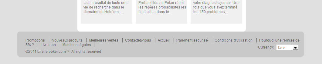 Foster Posted September 3, 2011 Author Share Posted September 3, 2011 J'ai réssayé le code de carl mais rien à faire (merci quand même carl ) par contre l'astuce de Atch a bien fonctionnée, merci ! Par contre je ne sais pas si il y a un rapport car en faisant en même temps d'autre manip (changement couleur du block catégorie) j'ai plein de trucs qui se sont décalés... ? J'ai retiré google + 1 mais rien à faire... Chose bizarre je n'ai pas ce problème sous explorer, qui au passage n'a pas pris en compte la modif pour le footer. Link to comment Share on other sites More sharing options...