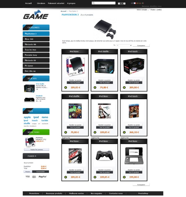 DeyDDy Posted August 25, 2011 Share Posted August 25, 2011 Bonjour la communauté, Je vous présente un nouveau thème gratuit que je mets à disposition nommé GameTheme Un thème sur deux colonnes noir et bleu compatible prestashop 1.4+ Ce thème comporte plusieurs modifications d'affichages: -Optimisation des images Catégories en page d'accueil -Optimisation des images des produits phares -Optimisation des images dans la liste des produits Intégration et modifications de plusieurs Modules gratuits: -Menu Haut horizontal (TopMenu) par Julien Breux -Catégories en page d'accueil (cw06_homecats) par tom06 -Menu Catégories Vertical par Maofree -Images dans le panier (Cart block with images) par Maofree -MGC carousel de produits sur la page d'accueil par sendul -Product.tpl modifié par Maury Girard "Un grand merci pour leurs contributions" Tous ces modules ont été modifier et adapter pour le thème Parfaitement fonctionnel et 100% valide au test du validateur prestashop Installation facile avec l'installateur de thème (topmenu) (catégories en page d'accueil) (MGC homecarousel) (Vertical menu) (BlockCart image) (Affichage product.tpl) Voilà je crois avoir tout dit ,n'hesitez pas ,toutes vos remarques sont la bienvenue Cdt GameTheme.zip Link to comment Share on other sites More sharing options...
