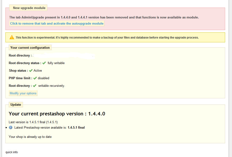 1. Replace&upgrade AdminUpgrade.php from prestashop 1.4.4.1 (latest version)
