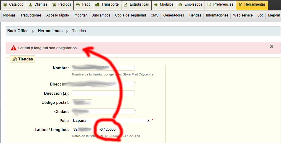 RogerBOSS Posted August 29, 2011 Share Posted August 29, 2011 Al configurar la posición terrestre de nuestra Tienda, el programa no acepta longitudes ni latitudes que empiecen por "0.xxxxxx", es decir, cuyo valor sea "inferior a la unidad". Ejemplo: LATITUD: 39.562341 / LONGITUD: -0.125000 Salta el mensaje de Error: "Latitud y longitud son obligatorios". Os adjunto una imagen del Backoffice > Herramientas > Tienda. ¿Alguien tiene idea de cómo resolver esto? Gracias de antemano. Link to comment Share on other sites More sharing options...