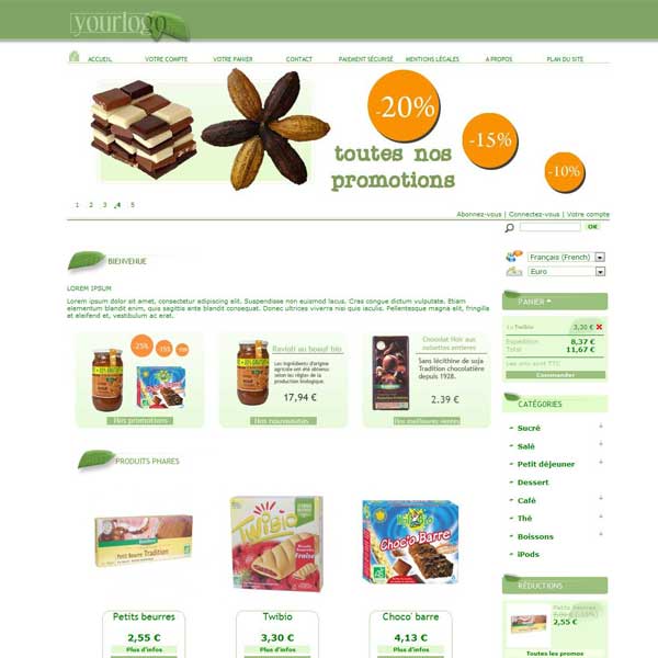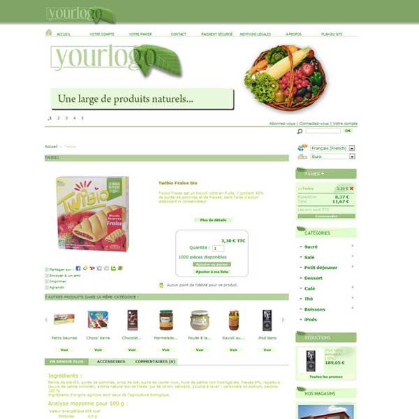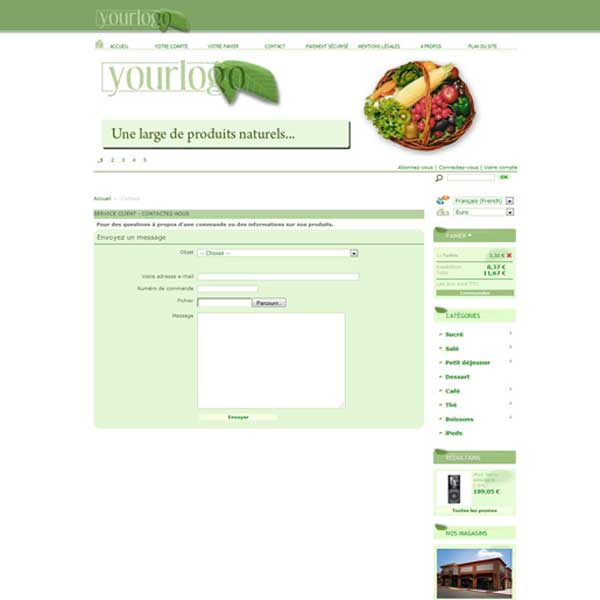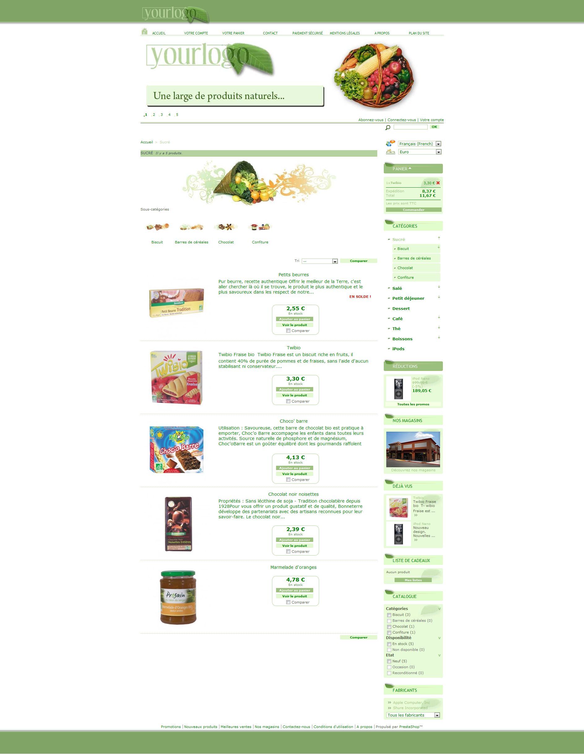 edwett Posted August 29, 2011 Share Posted August 29, 2011 Bonjour, Voici un nouveau thème Prestashop V1.4. Ce thème à l'ambiance claire aux couleurs dominantes vertes présenté sur deux colonnes conviendrait à une boutique de produits biologiques et naturels. Facilement éditable il peut être adapté à la vente de tous types de produits. Voir la démo ici. La fiche produit est ici. Dans l'archive: -les fichiers du thème -documentation EN/FR -modules complèmentaires : blocksearch modified freeblock home featured modified galleryslider block permanentlinks modified block languages and currencies block user info modified Cordialement. André Kersual Siret : 52074933400014 APE : 7410Z Link to comment Share on other sites More sharing options...