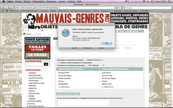 Autre bug très gênant sur la gestion des adresses dans Mon compte : Impossible de mettre à jour ou supprimer une adresse. Le click sur "mettre à jour" ou "supprimer" entraine l'affichage d'une page de création de nouvelle adresse.