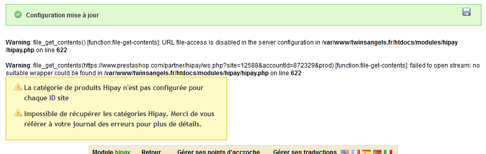 je fais face à un problème de configuration du module de paiement HiPay sur ma boutique Prestashop version 1.4.4.0