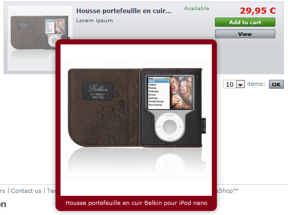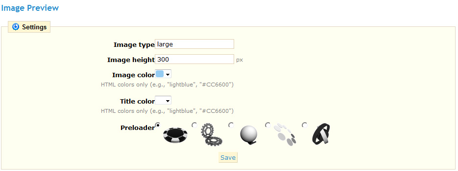 devsoft Posted September 5, 2011 Share Posted September 5, 2011 (edited) image preview (Category page/Features) This module allow fast image preview. Your custumers dont have to go everytime to product details to see larger image (more details). A lot of customer search from category page only. Now products can look more attractive. This can increase your sell. Light and fast module. Module Settings : you can choose image type to display specify image height image color title color 5 types of preloaders PrestaShop compatible: 1.2.X, 1.3.X, 1.4.X Demo: http://www.presta-mo...p?id_category=2 http://www.presta-mo...p?id_category=2 PrestaShop Addons http://addons.presta...ge-preview.html Edited May 26, 2012 by devsoft (see edit history) Link to comment Share on other sites More sharing options...