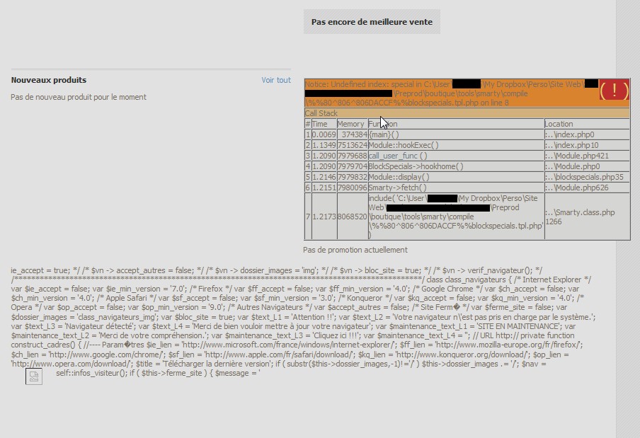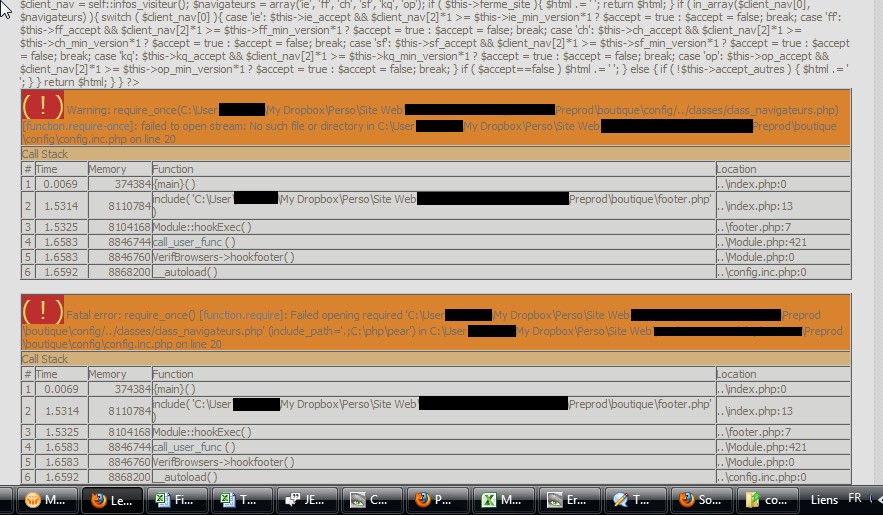 tomtomgoo Posted September 23, 2011 Share Posted September 23, 2011 Bonjour, Je sais que je vais paraître un peu bizarre mais voici ma démarche. J'ai commencé à travailler un site directement en ligne (puisque pas diffusé). J'ai pour objectif de le terminer rapidement et je souhaite pouvoir le travailler hors ligne. Donc je veux passer la version en ligne en local. Je travaille parfois sous mac et parfois sous windows. J'ai d'abord fait le transfert vers mon macbook sous MAMP sans soucis, ça fonctionne parfaitement (pretashop & wordpress). J'ai mis les fichiers et la base sur mon compte dropbox pour qu'ils soient synchronisés entre mon PC et mon Mac. Tout continue à bien fonctionner. Je configure WAMP sur mon PC pour avoir là aussi accès au site et c'est là que commence mon problème :-( : - wordpress fonctionne tout aussi bien que sous le mac - la back office de prestashop, idem - par contre le front office c'est une autre histoire... Pour une raison inconnue, le début de la page est bien interprété et au moment d'arriver à la partie "promotions", je vois directement du code non interprété. J'ai activé l'affichage des erreurs PHP et j'ai à l'endroit où ça commence à 'merdouiller' un "Notice" puis en bas de page un "Warning" puis une "Fatal Error". cf captures jointes. Mon approche est la suivante : comme cela fonctionne parfaitement sous le Mac avec MAMP, les mêmes fichiers et la même base de données, ça ne peut qu'être un pb de configuration du serveur. Le truc c'est que j'ai regardé un peu partout les configurations possible et je ne vois pas de pb. Est-il possible que ce soit par manque d'un module Apache ou d'une extension PHP? Que pensez-vous de mon approche? Avez vous une autre idée de piste? D'avance merci de votre aide. Thomas Link to comment Share on other sites More sharing options...