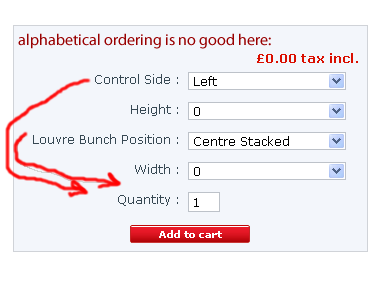 colin.gardom Posted September 29, 2011 Share Posted September 29, 2011 I've looked but cannot find. Advice appreciated. How can I order (re-order) Attribute Groups and Attributes within them. I know placing a 1. 2. 3. etc in front will work (up to 9 at least) but thats messy. See attached file. Also, I have attributes that have no effect on price eg. control side and bunch. Wish I could just add them once, but I have to add them for every combination. I'm guessing I need a scratch build or heavily modified cart here. I don't want a combination page in admin thats three foot long. Cheers. Colin Link to comment Share on other sites More sharing options...