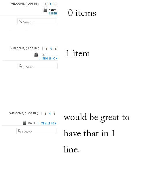 markus22 Posted October 2, 2011 Share Posted October 2, 2011 Hello i dont know how to figer it out, that all positions would be in one line. i tryed many ways, but i cant figure it out. for now it looks very ugly that the items are displayed unter the shopping cart picture.. iam using this code : <!-- Block user information module HEADER --> <div id="header_user"> <div class="header_links"> <li> {l s='Welcome' mod='blockuserinfo'}, {if $logged} <b><a href="{$base_dir_ssl}my-account.php">{$customerName}</a></b> (<a href="{$base_dir}index.php?mylogout" title="{l s='Log me out' mod='blockuserinfo'}">{l s='Log out' mod='blockuserinfo'}</a>) {else} (<a href="{$base_dir_ssl}my-account.php">{l s='Log in' mod='blockuserinfo'}</a>) {/if} </p> </div> <div class="shopping_cart"> <a href="{$base_dir_ssl}order.php"><h4> {l s='Cart' mod='blockuserinfo'}</a> : </h4> <span class="ajax_cart_no_product {if $cart_qties > 0}hidden{/if}">{l s='0 ITEM' mod='blockuserinfo'}</span> <span class="ajax_cart_quantity">{if $cart_qties > 0}{$cart_qties}{/if}</span> <span class="ajax_cart_product{if $cart_qties != 1} hidden{/if}">{l s='ITEM' mod='blockuserinfo'} <span class="ajax_cart_total">{if $cart_qties > 0}{convertPrice price=$cart->getOrderTotal(true)}{/if}</span></span> <span class="ajax_cart_product {if $cart_qties < 2} hidden{/if}">{l s='products' mod='blockuserinfo'} <span class="ajax_cart_total">{if $cart_qties > 0}{convertPrice price=$cart->getOrderTotal(true)}{/if}</span> </span> </li> </div> </div> <!-- /Block user information module HEADER --> Link to comment Share on other sites More sharing options...