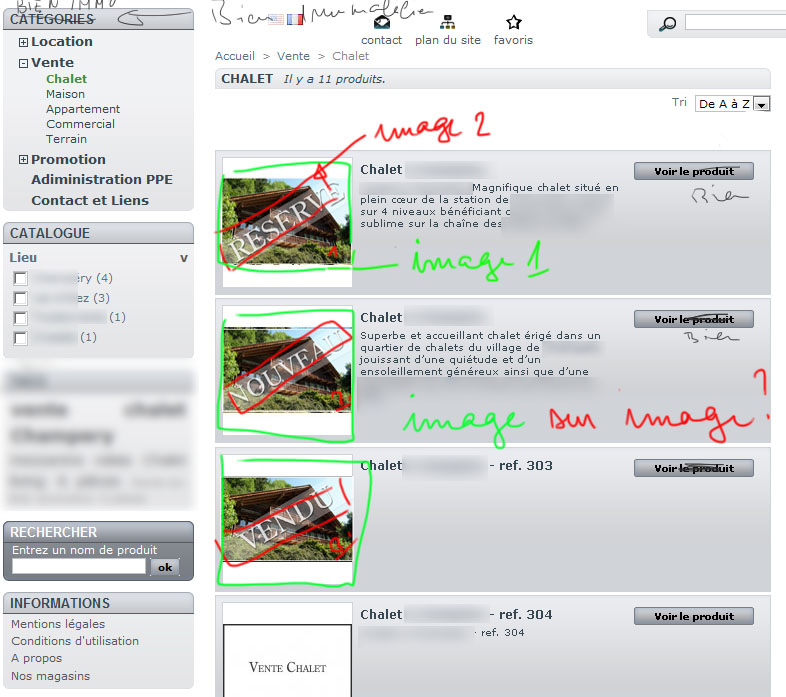 herby Posted October 4, 2011 Share Posted October 4, 2011 prestashop 1.4.4.0, mode catalogue. Je suis nouveau, cela n'empêche pas que j'ai parcouru le forum et que je n'ai pas trouvé de réponse à ma question. Comment superposer 2 images de manière simple dans prestashop (ou 1 image et un texte). L'idée est la suivante: afficher un bandeau (png pour tranp.) par dessus une image produit. Un texte css en lieu et place de l'image est également pertinent. Le bandeau img ou texte ne doit pas être visible dans "voir le produit" ou dans la galerie. Je souhaite obtenir qque chose de similaire voir image jointe. Si le sujet ce trouve dans le forum, merci de me donner le lien, Sinon, merci de me donner une direction. Débutant prestashop Merci à tous Link to comment Share on other sites More sharing options...