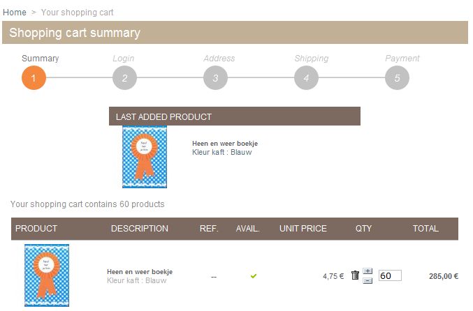 The last one is when I add 60 pieces of my product to my cart. As you can see, the product price doesn't match with the quantity discount for the amount I want to buy.