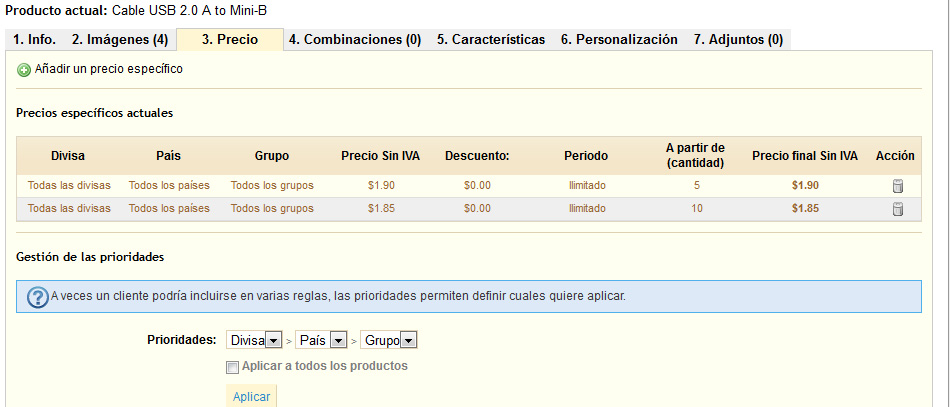 Sergio Ruiz Posted January 20, 2013 Share Posted January 20, 2013 (edited) no konsigo hacerlo con la 1.5.3.1 alguien sabe komo se hace para esta version¿saludos y muchas gracias Lo descuentos, en la 1.5, los puedes hacer generales, como esta guía: http://victor-rodena...prestashop-1-5/ que me he encontrado por la red. O los puedes, hacer especificos para el producto, editando la ficha del producto, en la pestaña "Precio", en la parte donde dice: Precios especificos Edited January 20, 2013 by Rubalcaba (see edit history) 2 Link to comment Share on other sites More sharing options...
